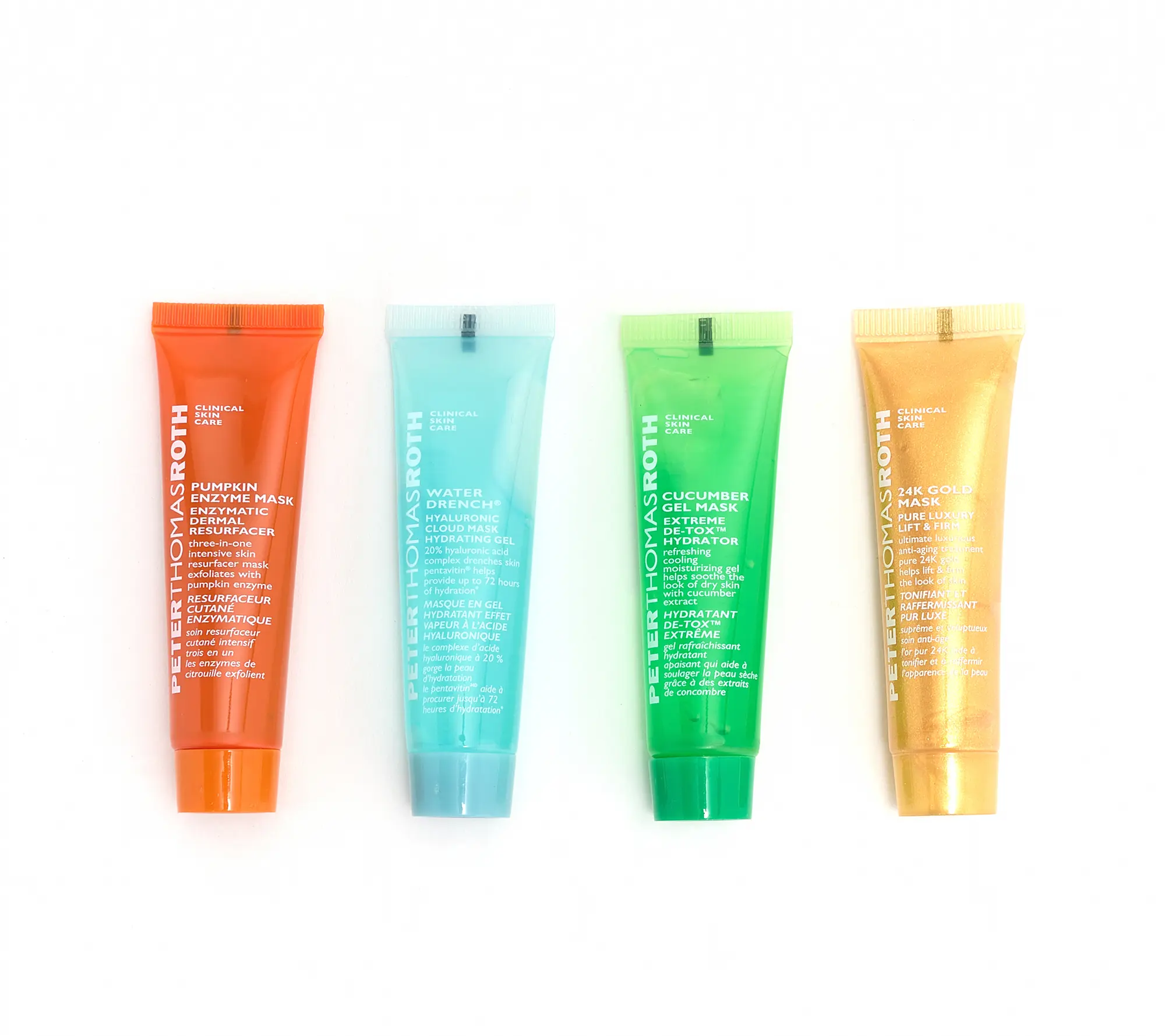 (1) Cucumber Mask .47 fl. oz. (1) Pumpkin Mask .47 fl. oz. (1) Gold Mask Deluxe .47 fl. oz. (1) Water Drench Mask .47 fl. oz. ---------------------------------------------------------------------- ---------------------------------------------------------------------- ---------------------------------------------------------------------