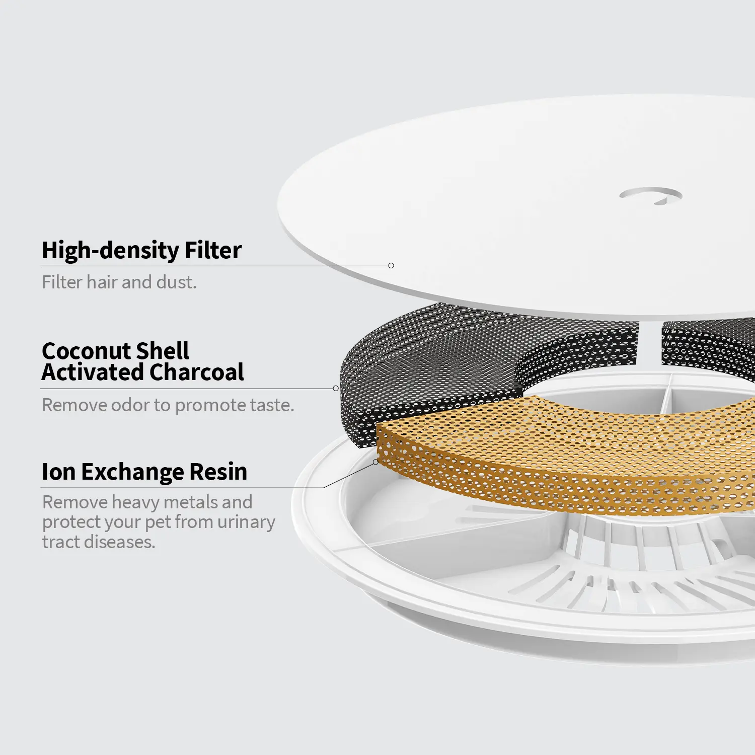 Muti-layer filtration system: Improved filtration function. Utilizing double filter components and a high-density micropore filter, PETKIT filter unit 3.0 filters remove pet hair and most other impurities, ensuring your pets always drink the cleanest and freshest water.