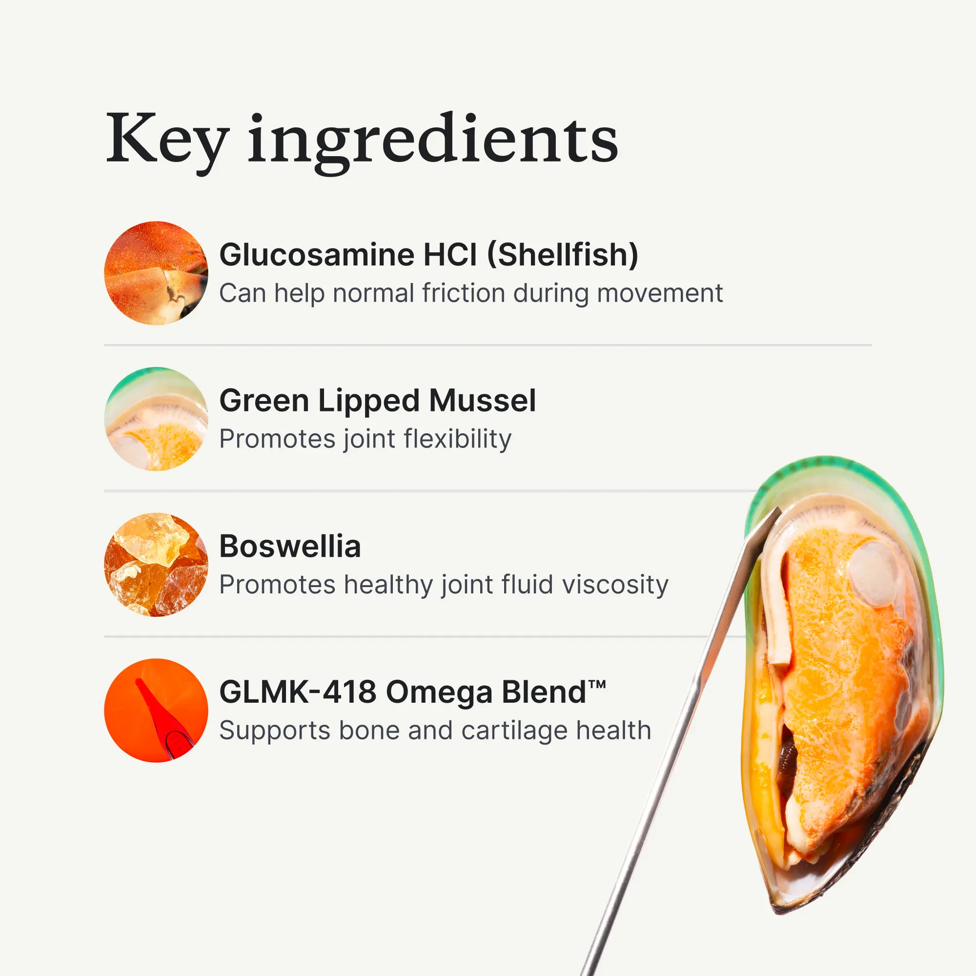 ·GLMK-418 Omega Blend™ delivers omega-3 fatty acids that support muscular strength, healthy hips and joints, and a normal inflammatory response.