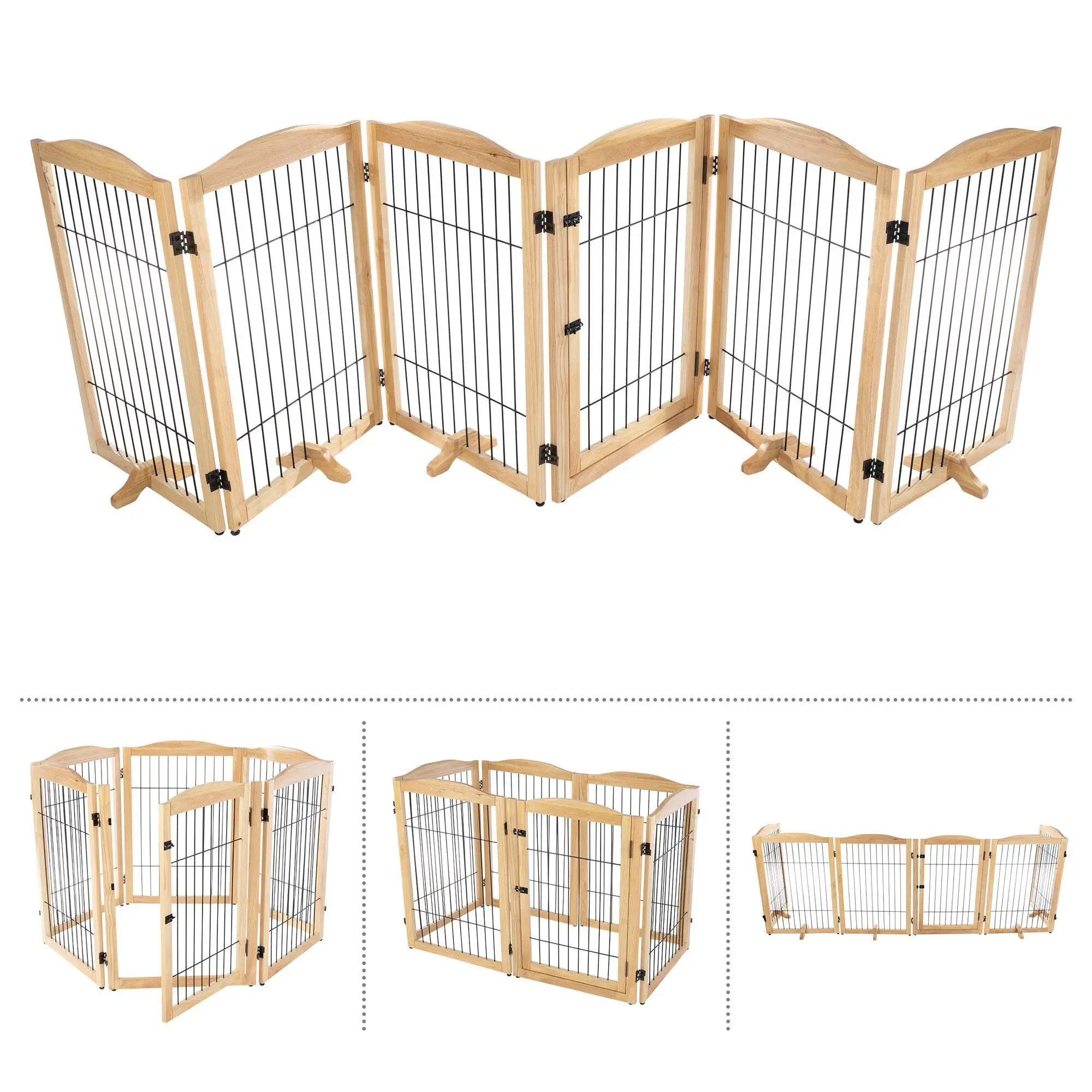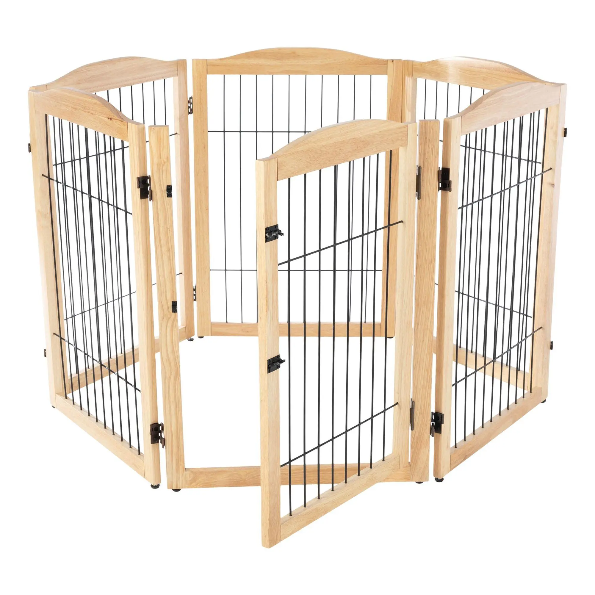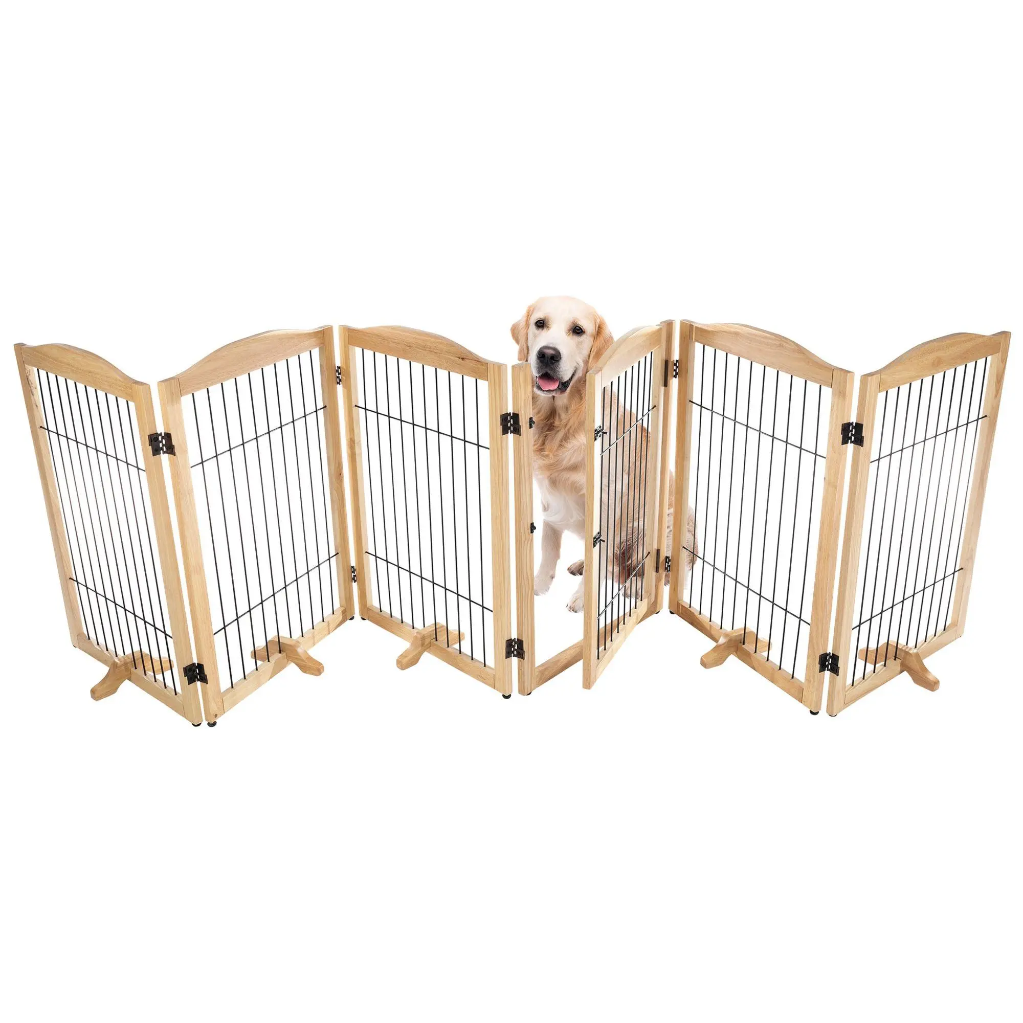 Keeping your pets out of areas they don't belong has never been easier than with the Petmaker six-panel indoor folding fence. This stylish wooden gate is perfect for blocking off doorways, hallways, and stairs, and can even be configured into a playpen. Its freestanding design includes support feet for added stability and folds compactly for easy storage. From Petmaker.