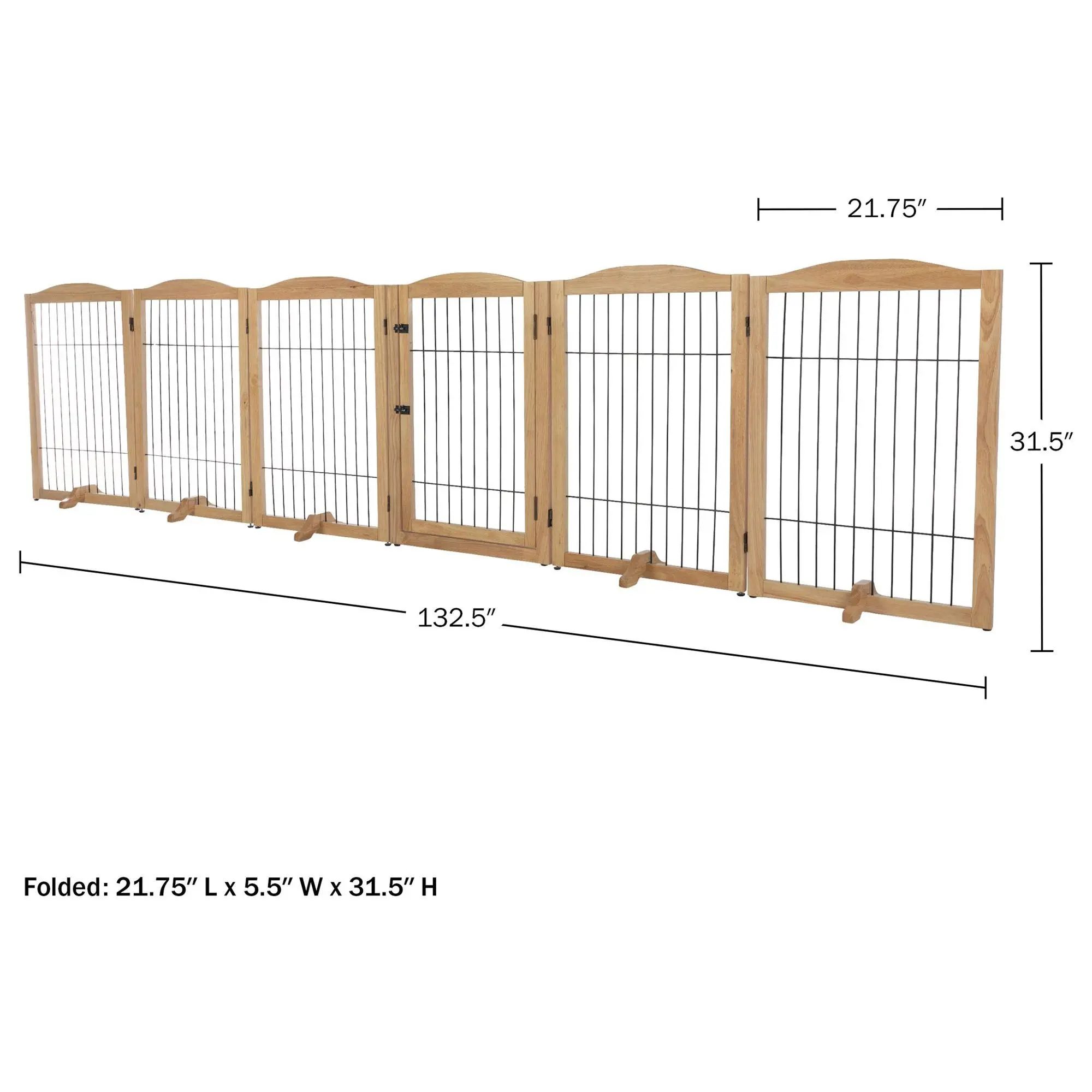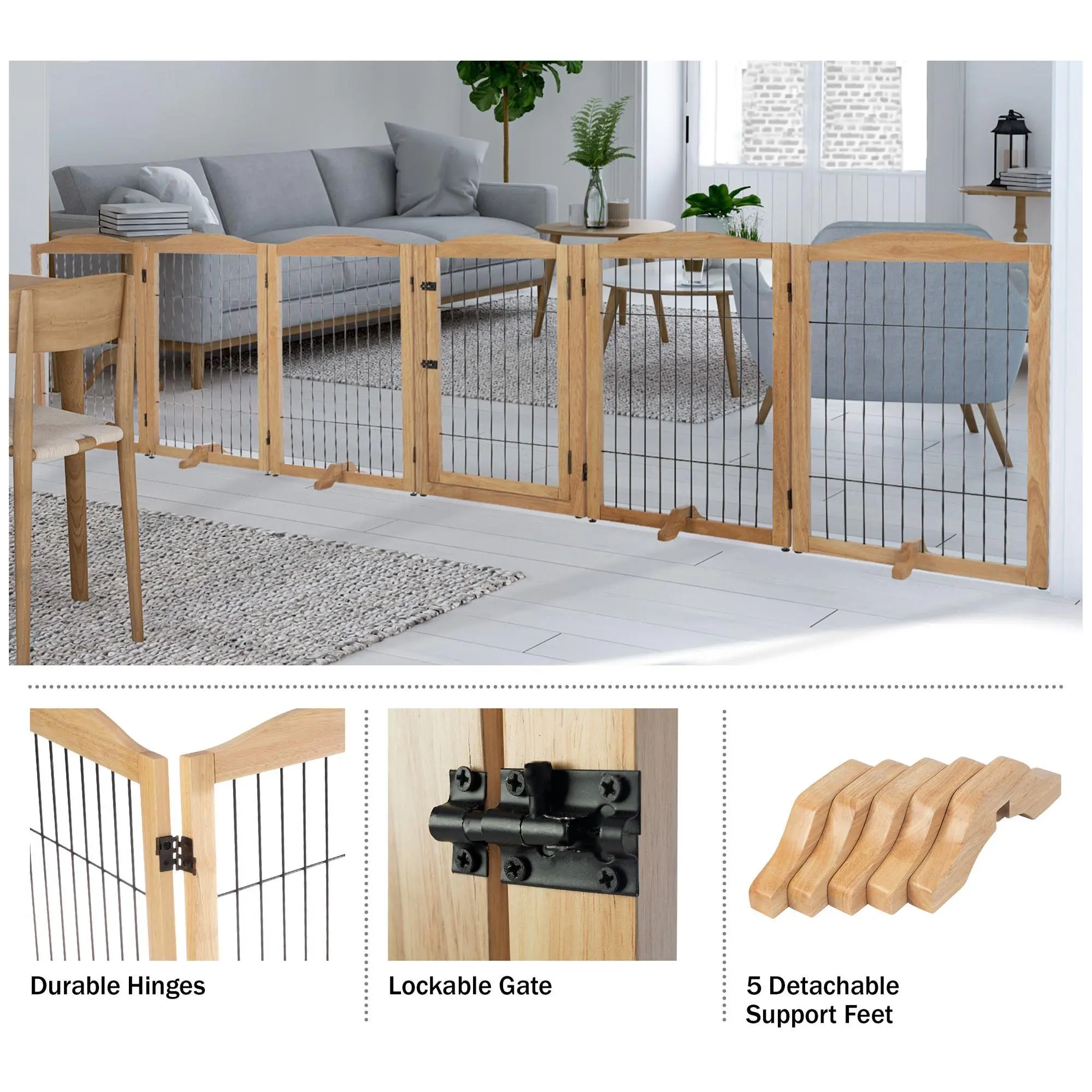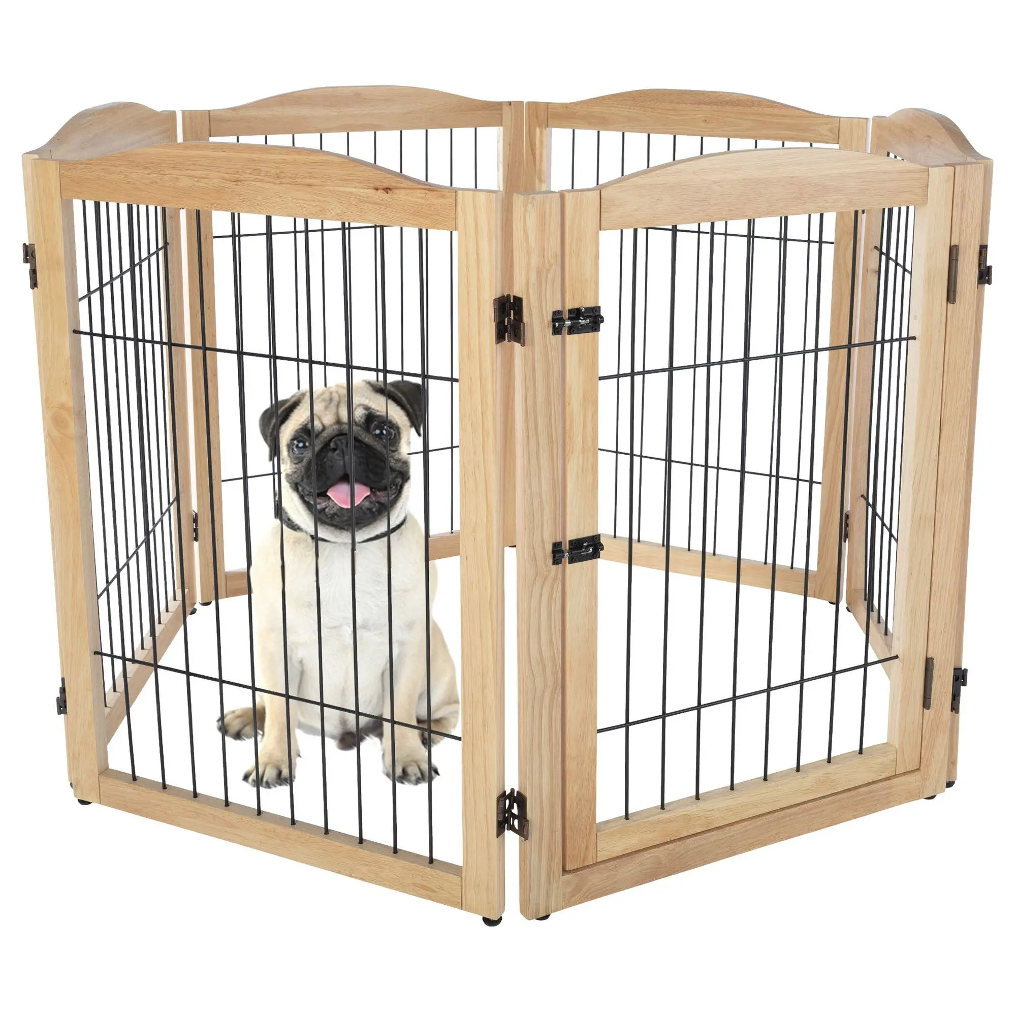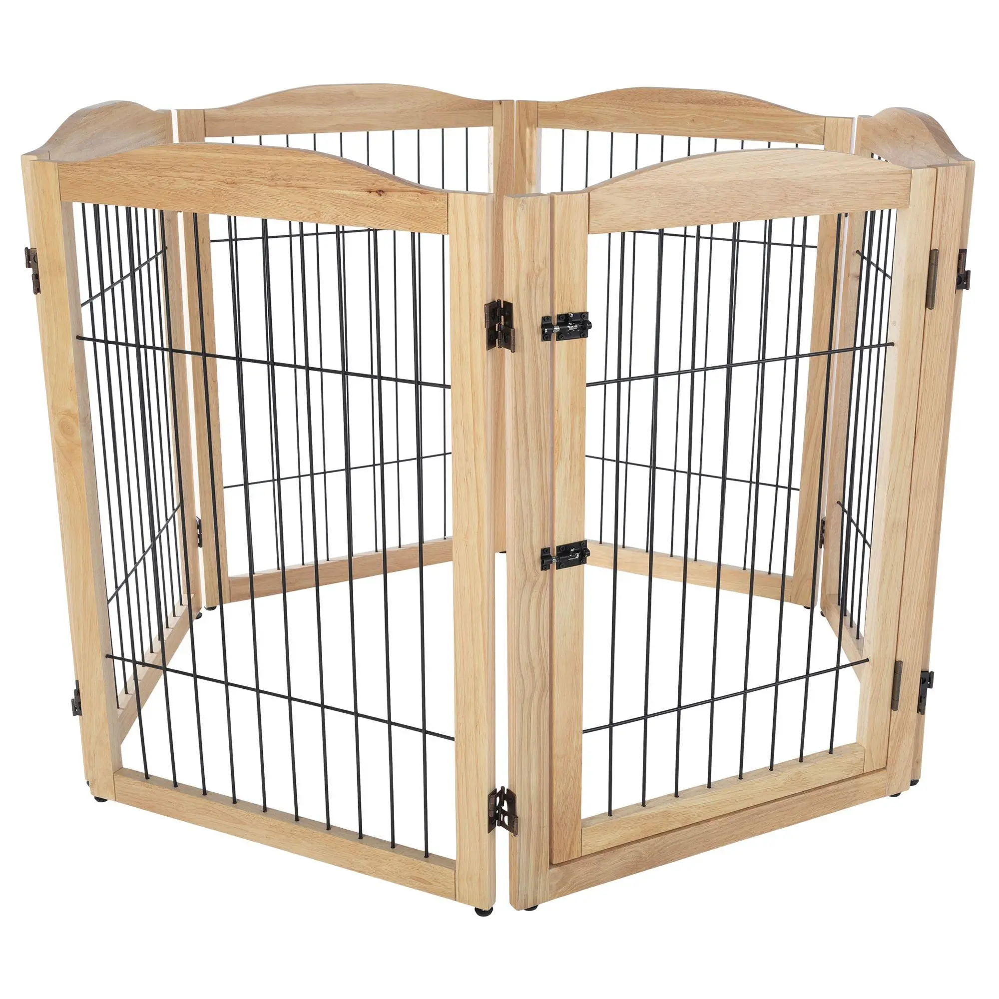 Keeping your pets out of areas they don't belong has never been easier than with the Petmaker six-panel indoor folding fence. This stylish wooden gate is perfect for blocking off doorways, hallways, and stairs, and can even be configured into a playpen. Its freestanding design includes support feet for added stability and folds compactly for easy storage. From Petmaker.