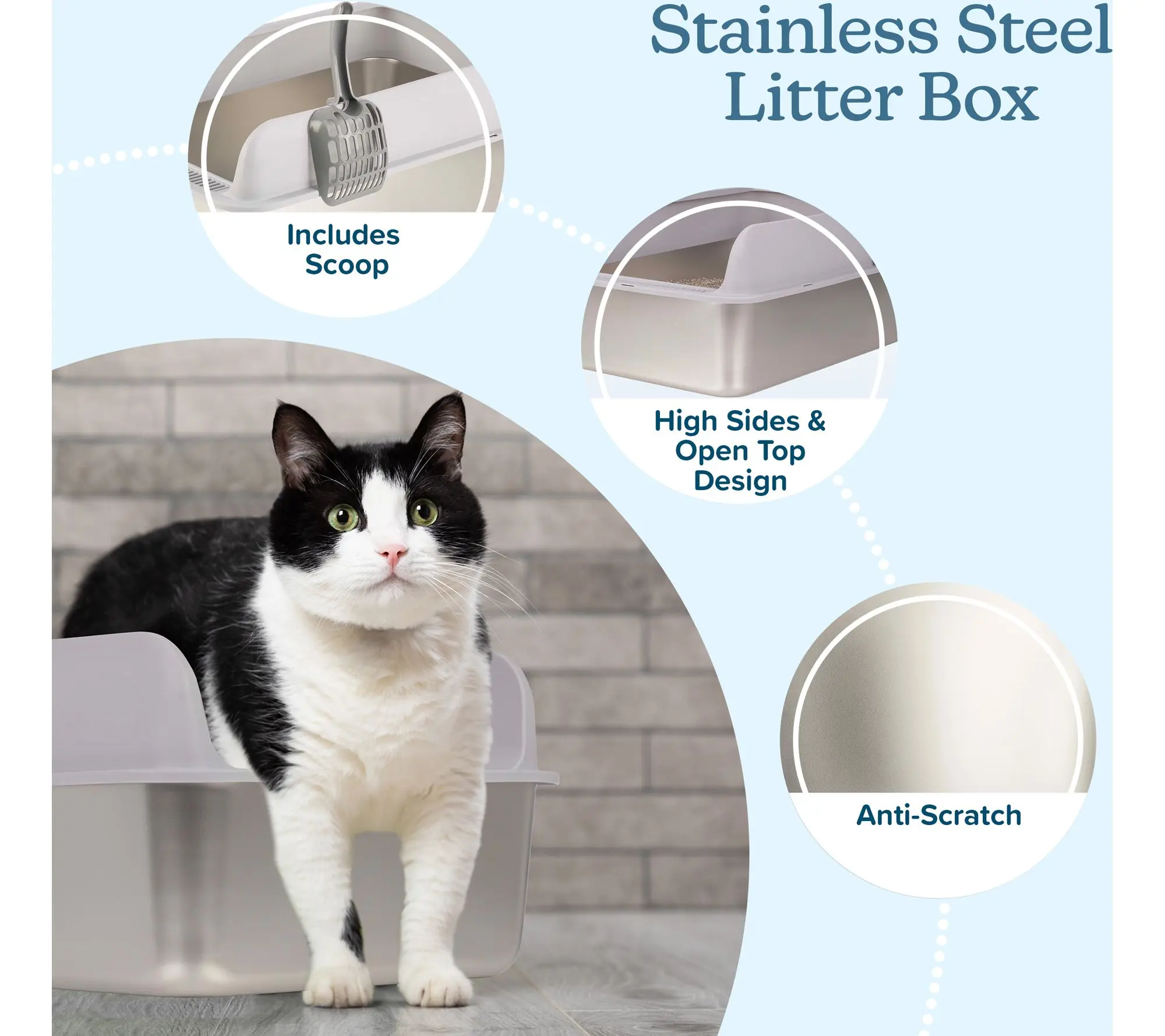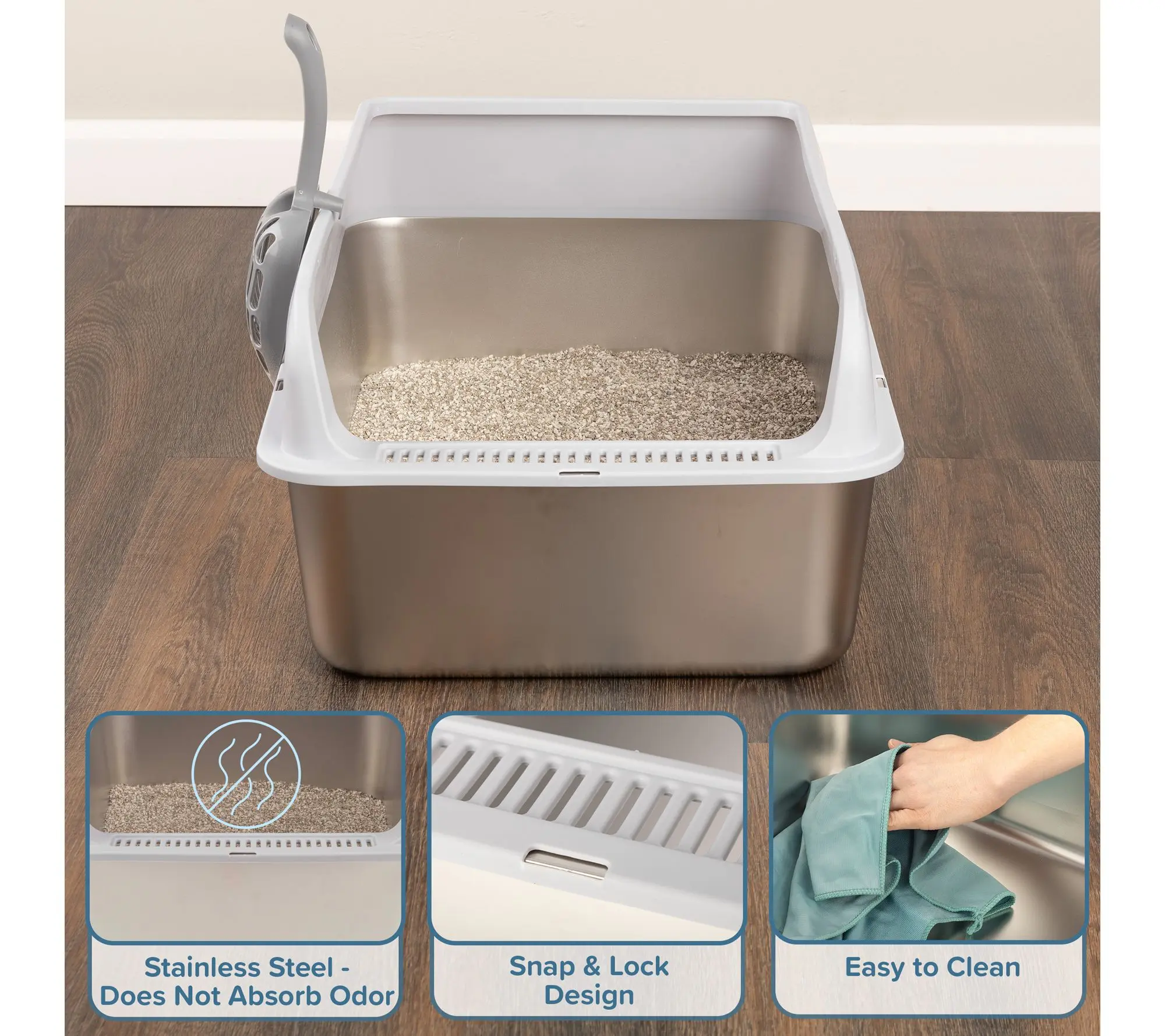 Give your cat a spacious and hygienic spot with this enclosed stainless steel litter box by PETMAKER. Made from odor-resistant stainless steel, it features a high wall lid for privacy, an open top for good airflow, and a snap-lock design to help contain messes. The smooth surface cleans up quickly with just soap and water, and a handy litter scooper is included for added convenience.