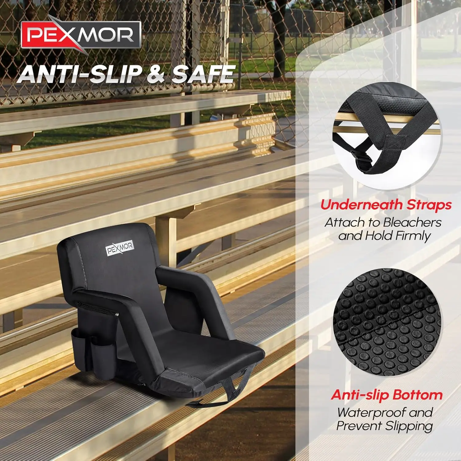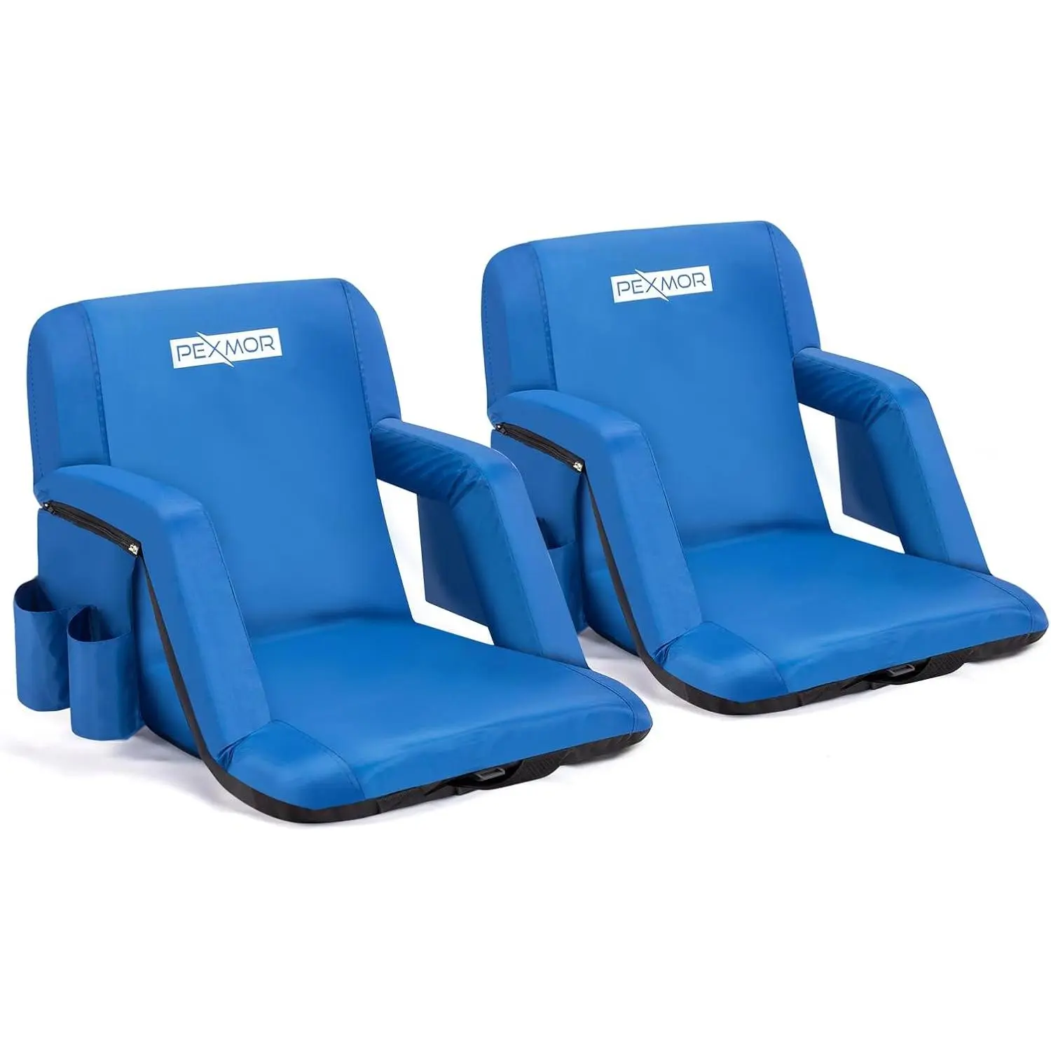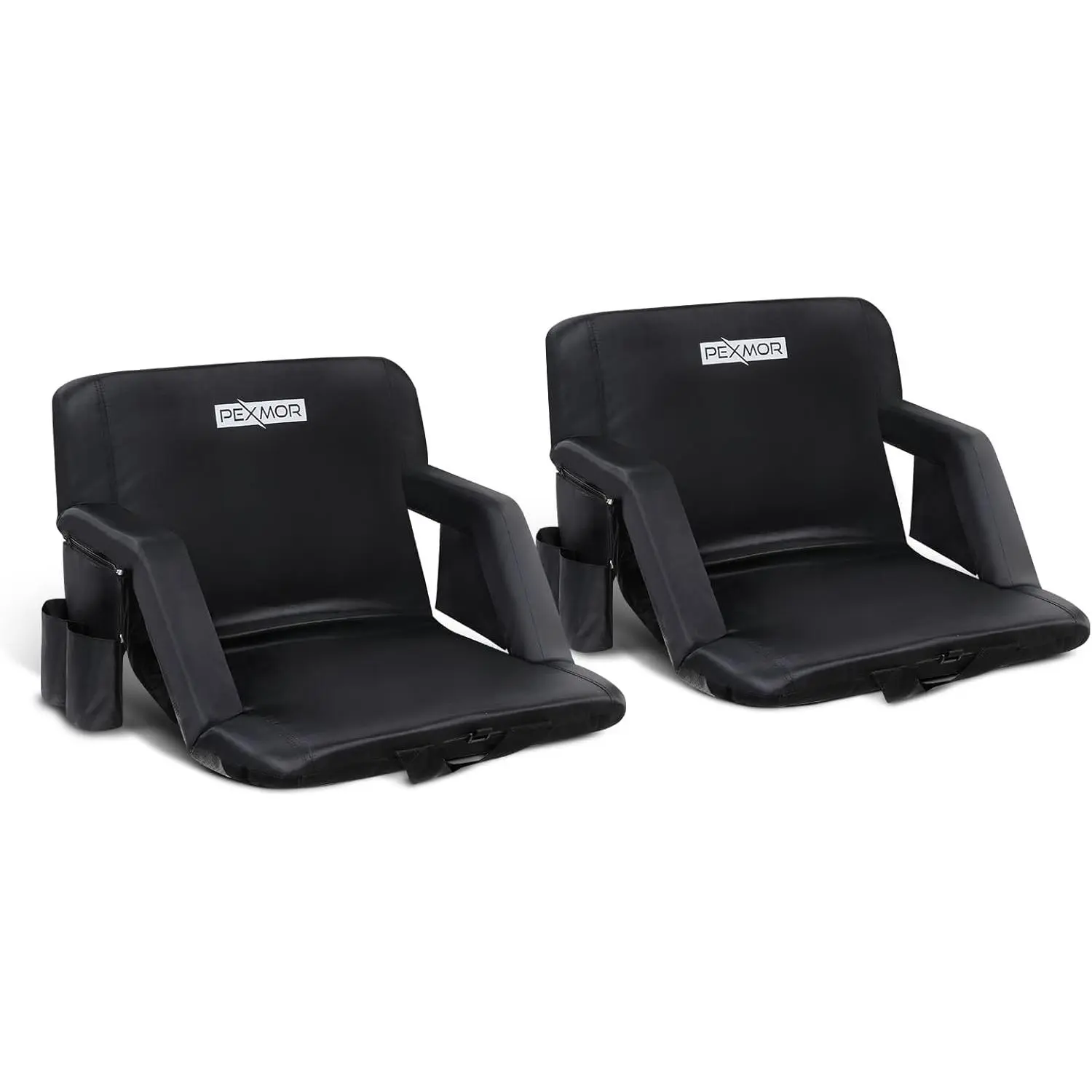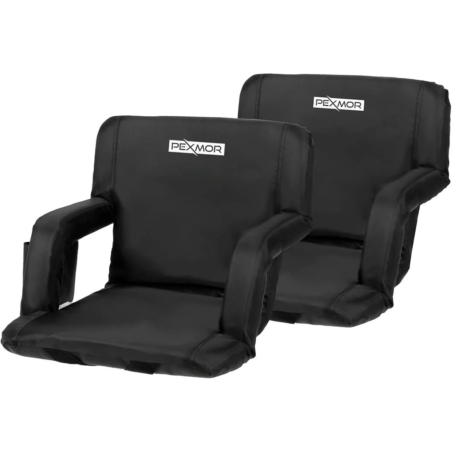 ✨ PEXMOR Folding Stadium Seats for bleachers with back support. These bleacher chairs feature a cushion and armrest, offering 5 reclining positions. Portable and padded, they come with pockets and a carrying bag. Each set includes 2 PCS with beverage pouch straps. Perfect for sports events and concerts.
