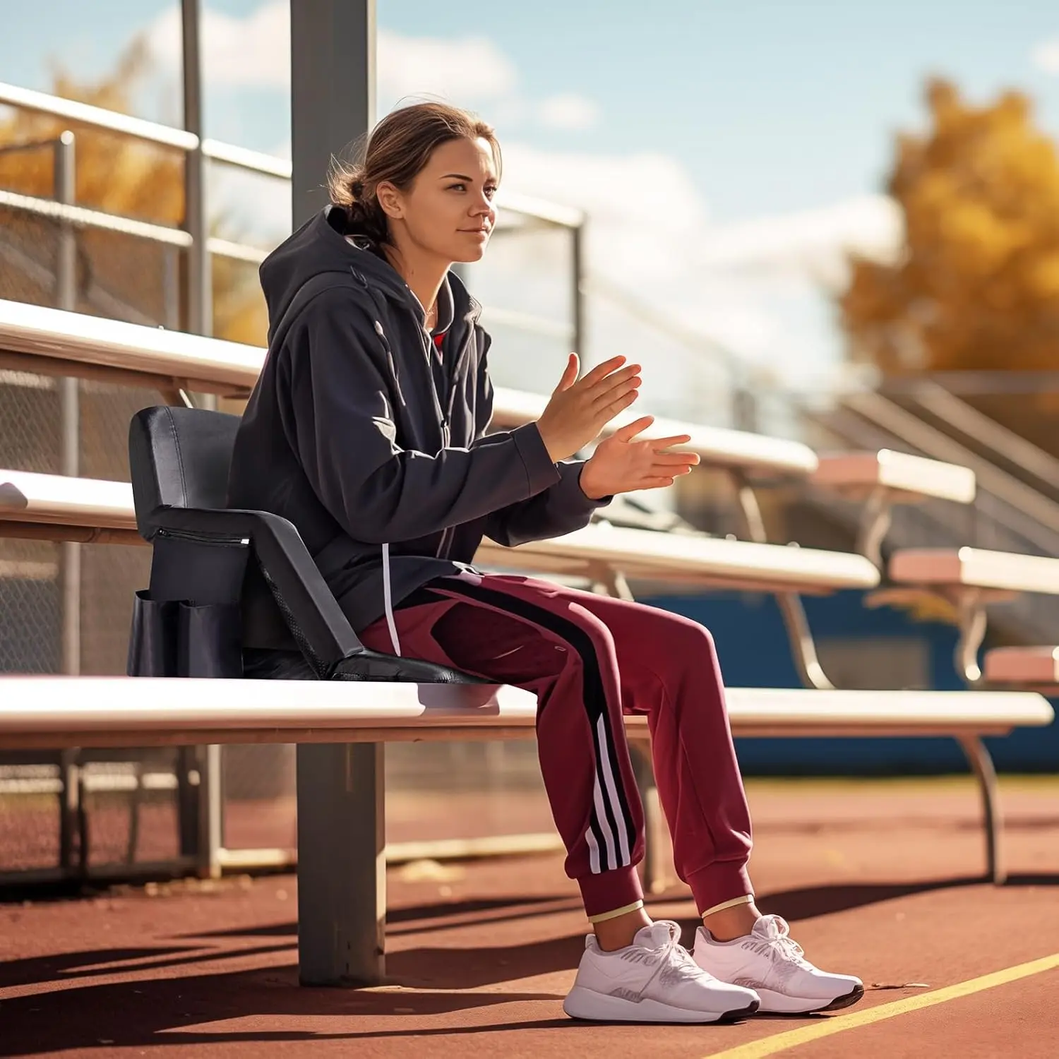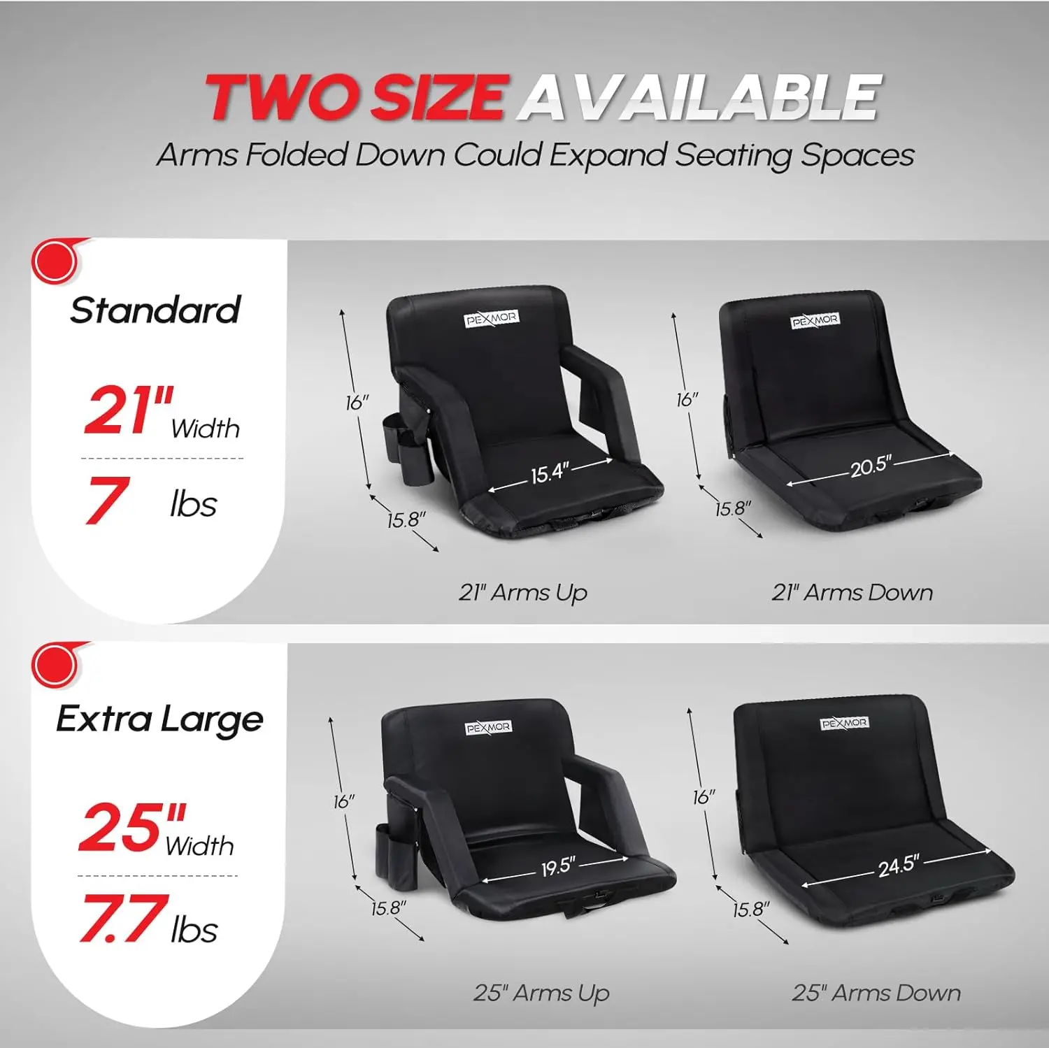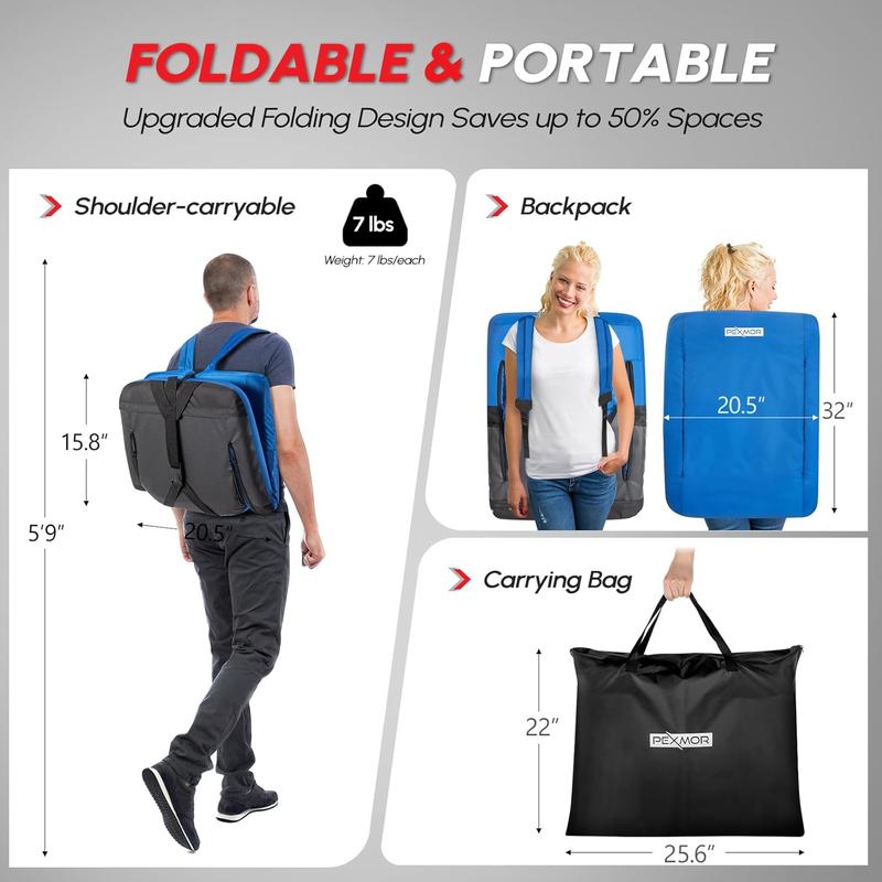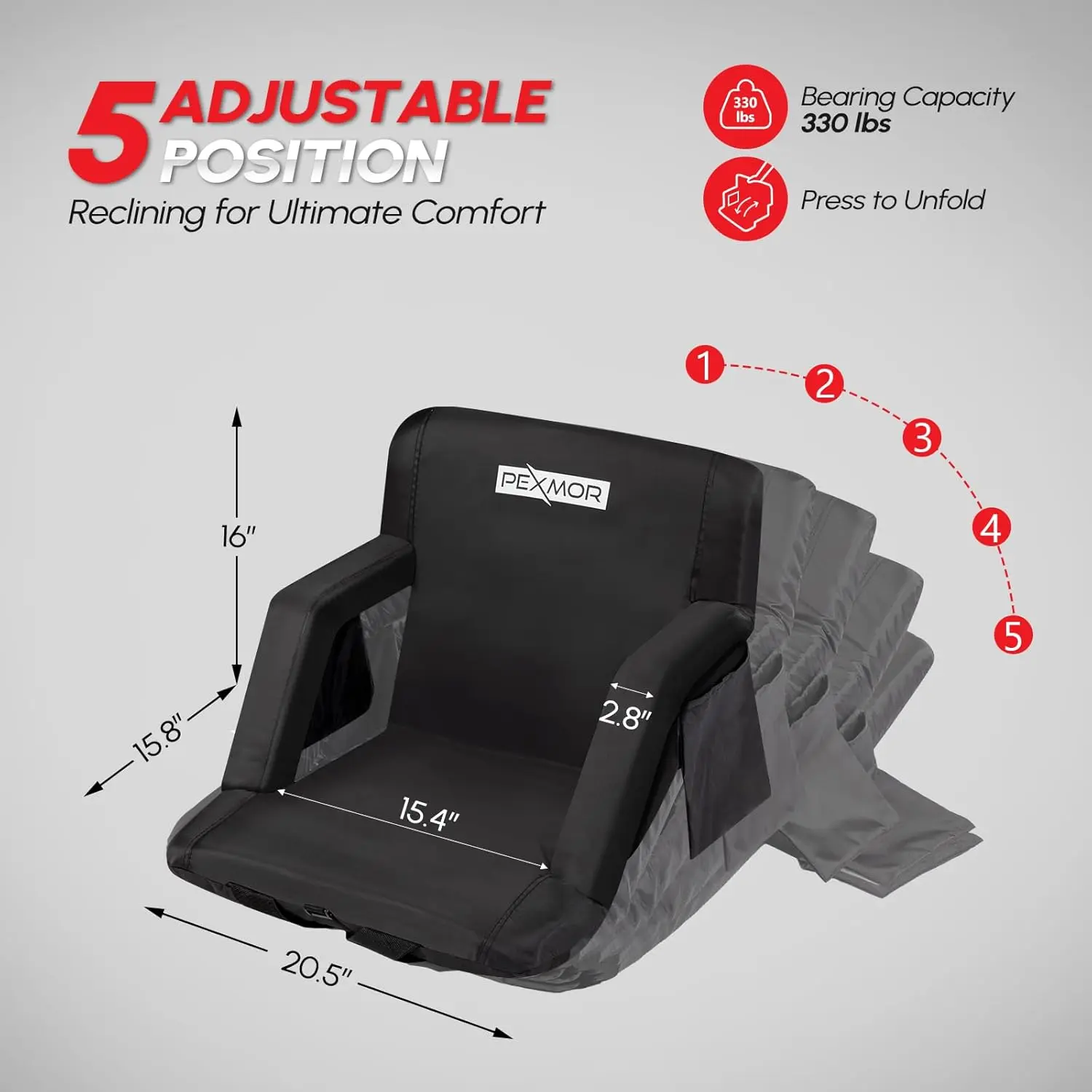 ✨ PEXMOR Folding Stadium Seats for bleachers with back support. These bleacher chairs feature a cushion and armrest, offering 5 reclining positions. Portable and padded, they come with pockets and a carrying bag. Each set includes 2 PCS with beverage pouch straps. Perfect for sports events and concerts.