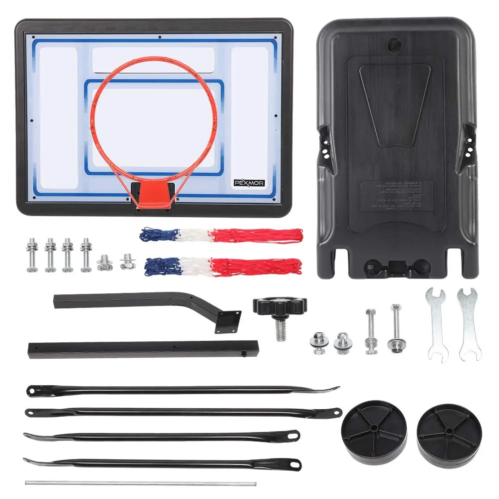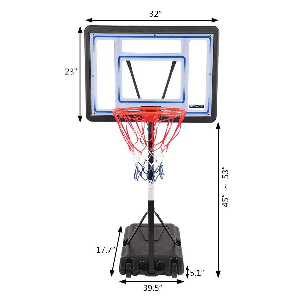 Adjustable Height: 45"-53",Square Basket Rod Diameter: 15.75" /13.78" Backboard Size: 32" x 23" Base Size: 29.53" x 17.72" x 5.12" Basket Diameter: 16.54" Can Be Filled With 25L Water Or 30KG Sand Gross Weight: 20.94lb / 9.5kg