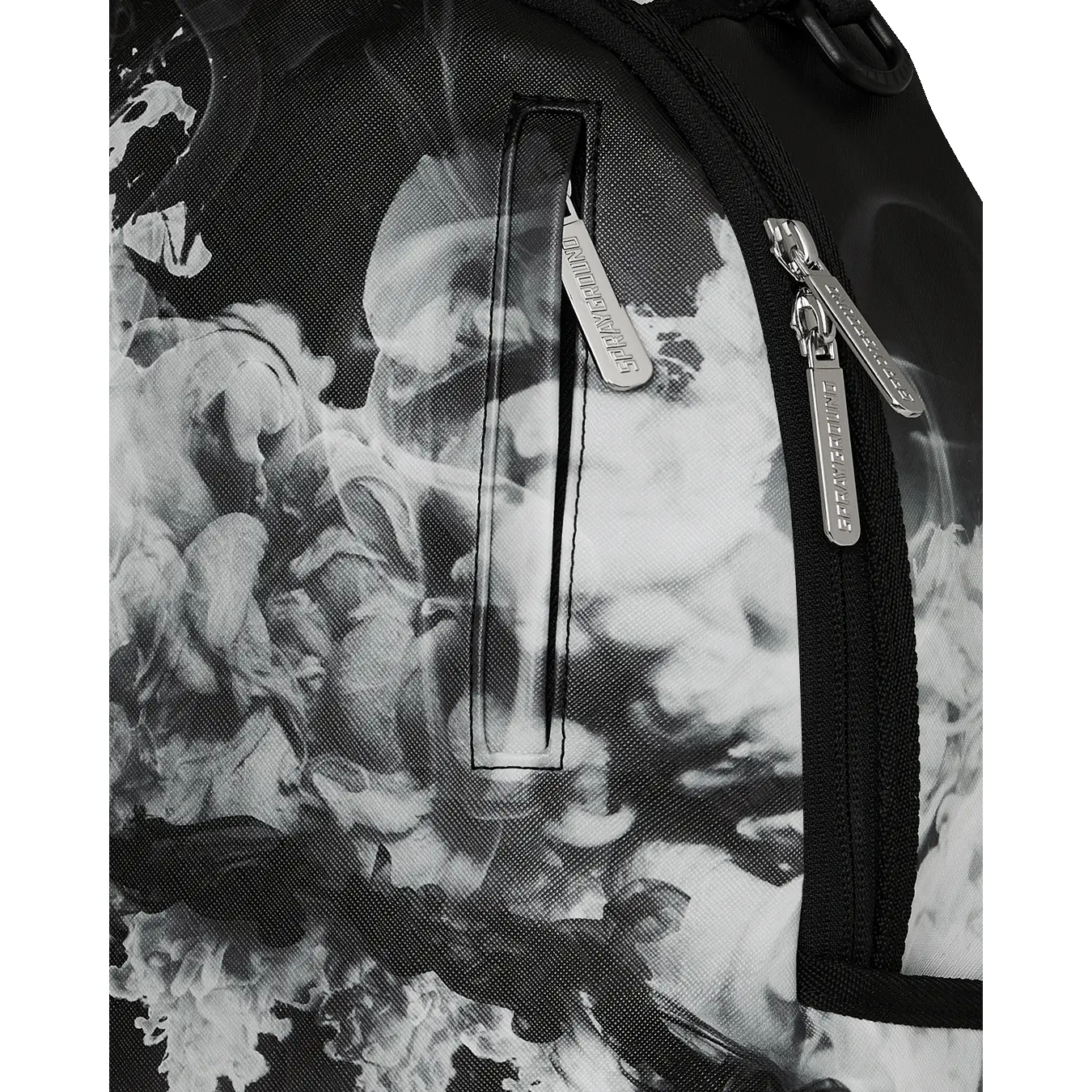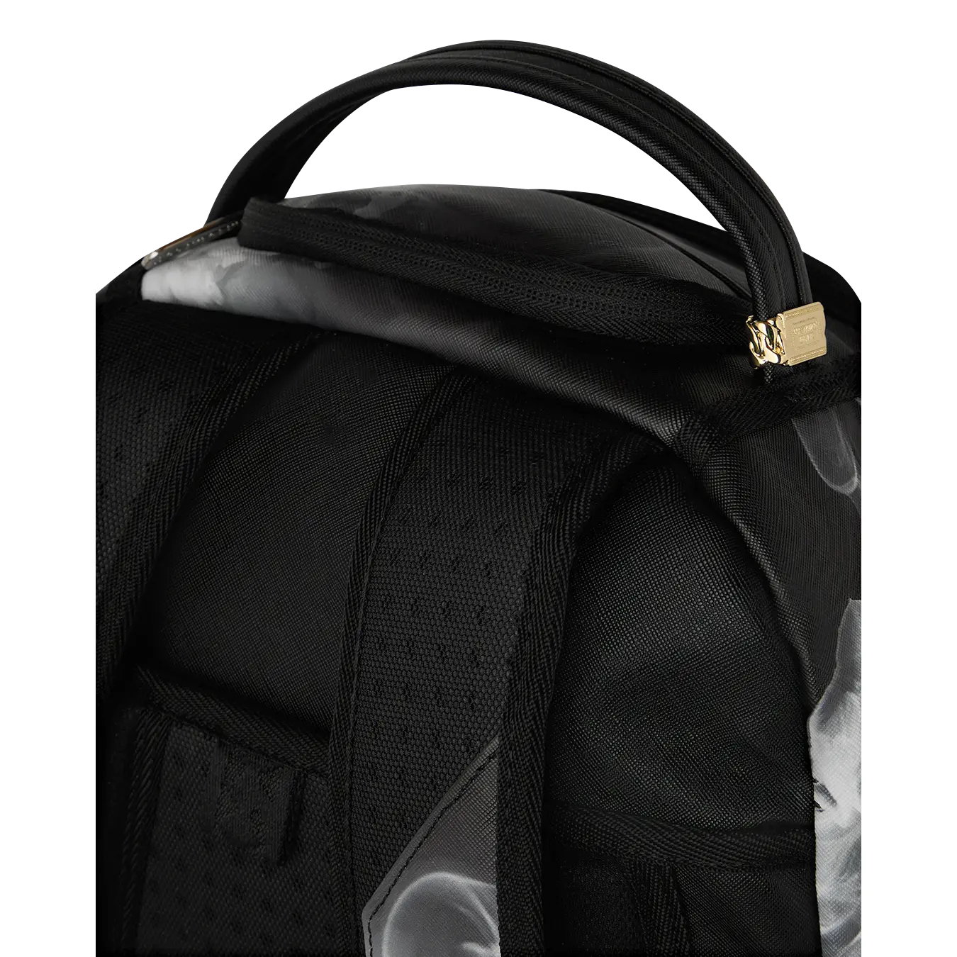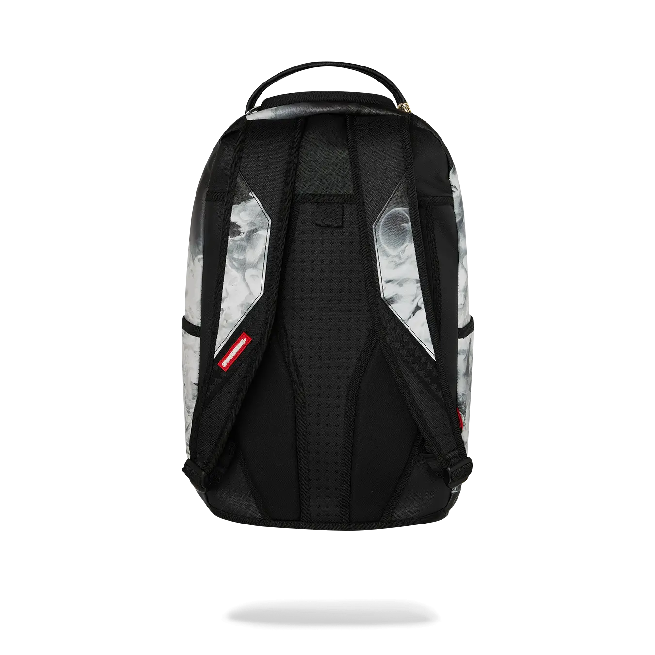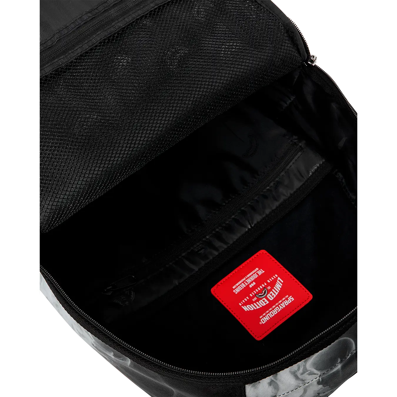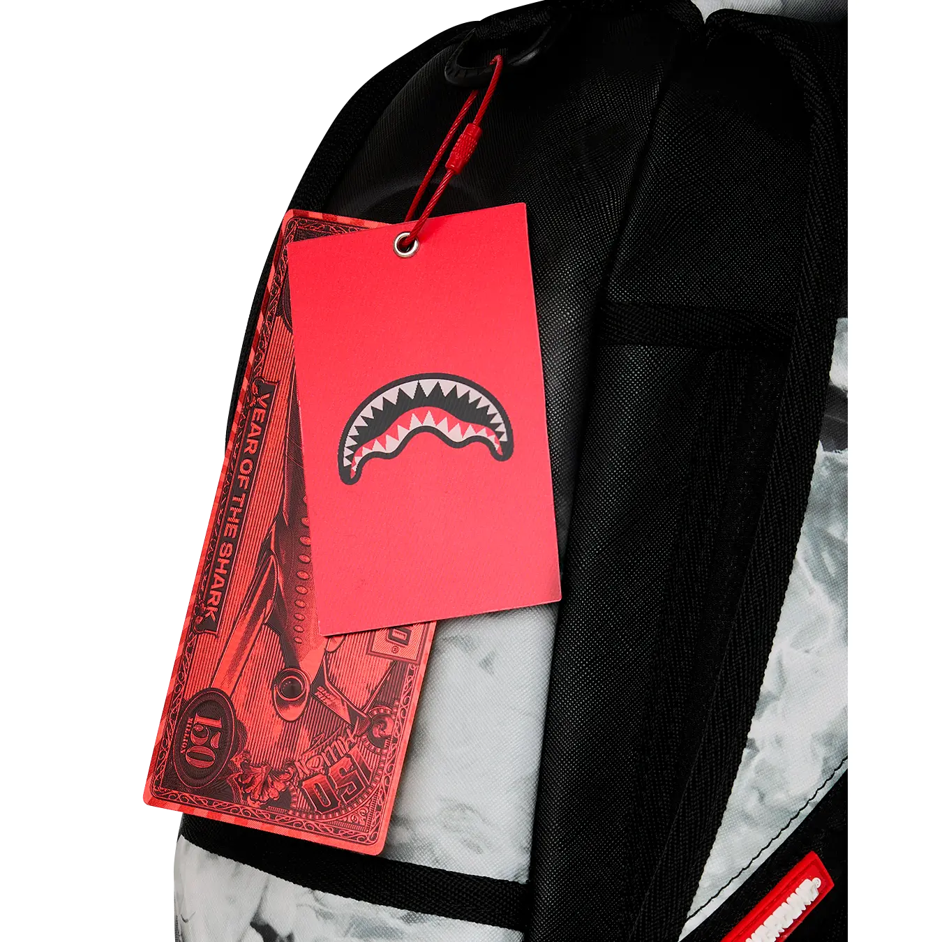 Dimensions: 18" x 6" x 11.5" • Front zipper pocket • Side pockets • Zippered Stash pocket • Separate velour sunglass compartment • Ergonomic mesh back padding • Adjustable Straps for custom sizing • Gold zippers with metal hardware • Metal "Sprayground Authentic" badge • Slide through back sleeve connects to carry-on luggage to free your hands