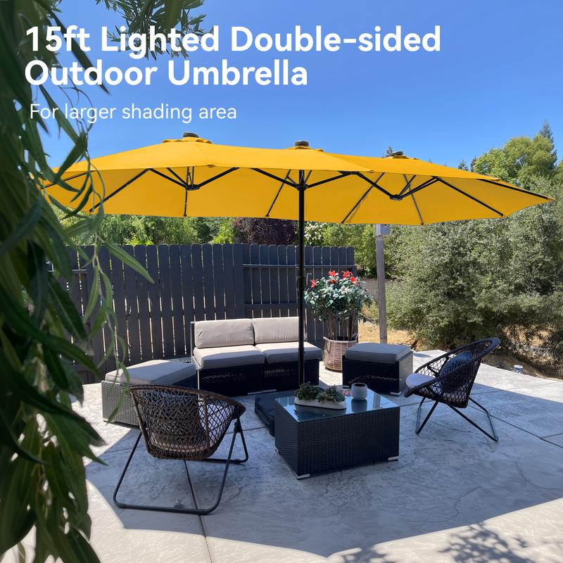 PHI VILLA this 15 ft large patio umbrella features a double-sided design, which gives you maximum shelter that brings you large shades for your outdoor enjoyment. Perfectly suitable for residential and commercial locations
