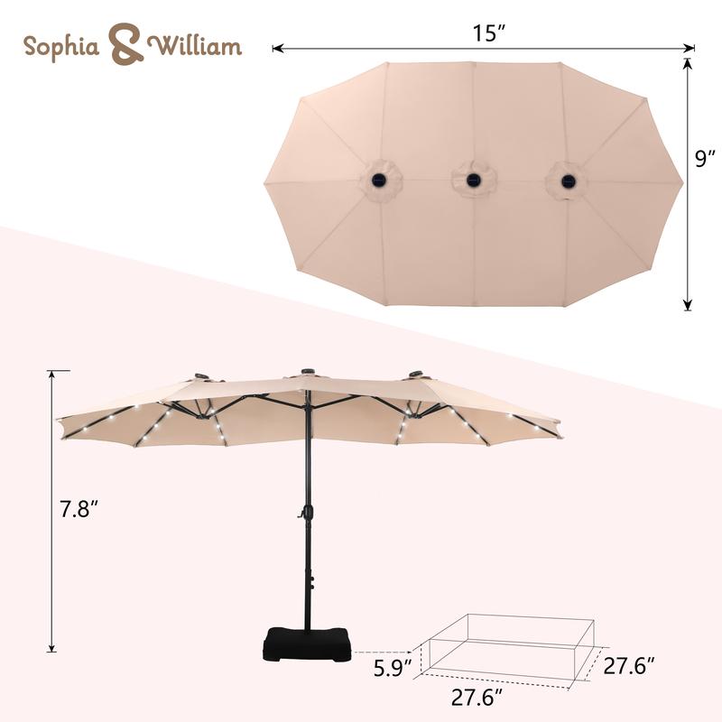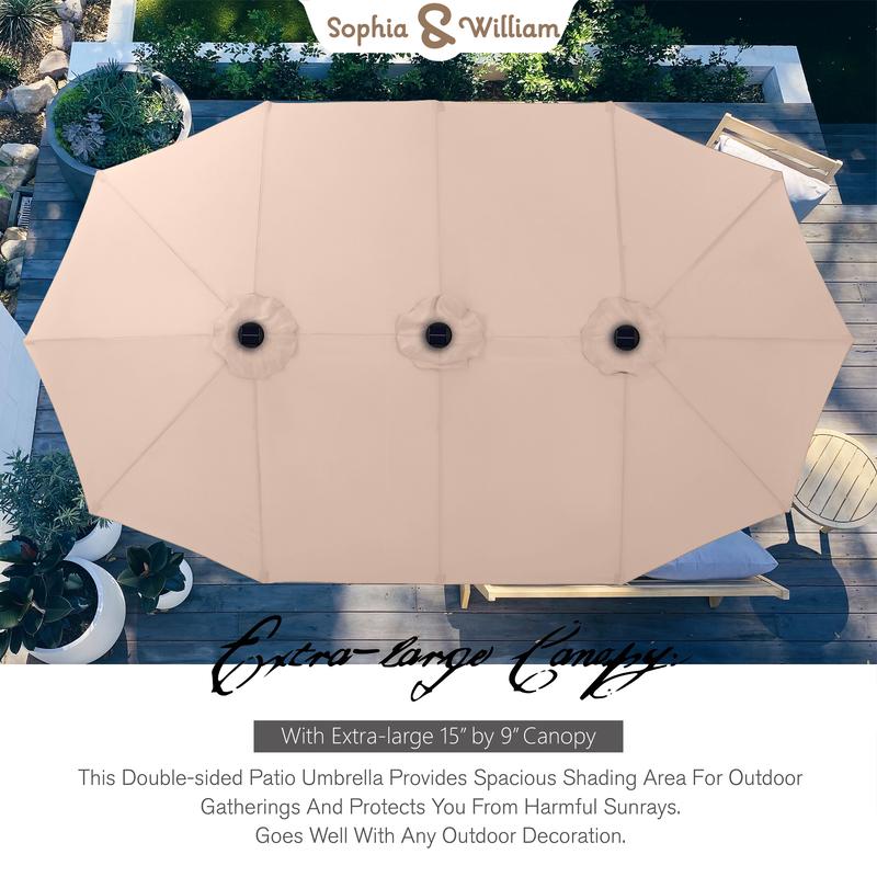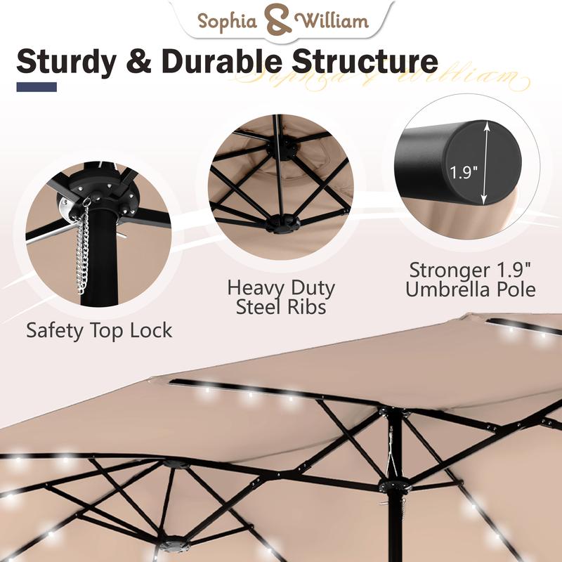 Elevate your outdoor space with the Sophia & William 15FT Patio Umbrella. Its extra-large shade, rust-resistant steel frame, and UV-resistant canopy offer long-lasting durability. Available in both LED and non-LED options, it fits any outdoor need—so you can enjoy comfort and style day or night.