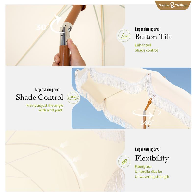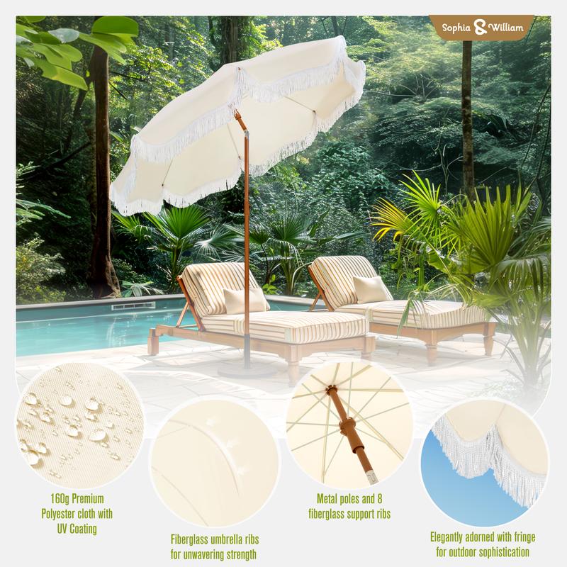 【Sophia&William】 7ft Patio Umbrella with Fringe, UPF 50+ Canopy, 8 High Wind Proof Fiberglass Ribs, Fully Assembled, Carry Bag Available Outdoor Aesthetic Round,