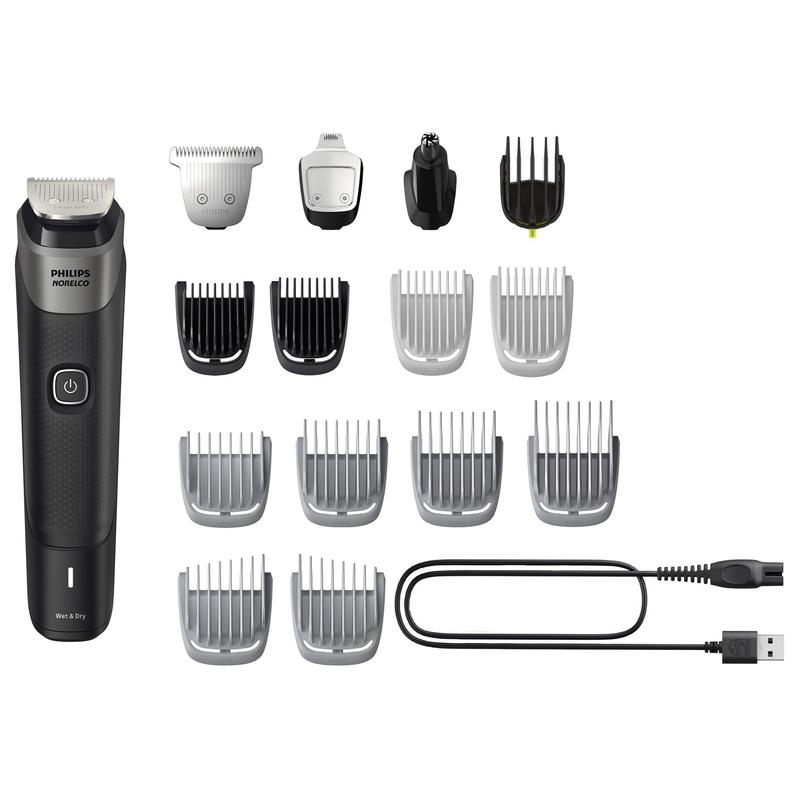 ·Includes Multigroomer Series 5000, steel trimmer, steel precision trimmer, nose and ear trimmer, 1mm stubble guard, 2mm stubble guard, adjustable comb, extra-wide hair trimmer, 4mm hair guard, 9mm hair guard, 12mm hair guard, 16mm hair guard, two fading hair guards, 3mm body guard, 5mm body guard, USB-A charging cable, and travel bag