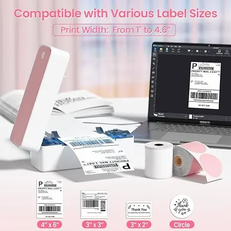 [Create Labels on the Go] Our desktop label printer for small business, works with any thermal labels with width of 1"-4.6".With this barcode label printer, helps you print shipping labels, logo labels, thanks labels, address labels and more.Print online without going to the post office!Morever, you can enjoy pre-designedl label templates, created for retail store and crafting businesses to help make products stand out.(Warm Tips: Need to be in the computer editing software "Labelife" to use the template.)