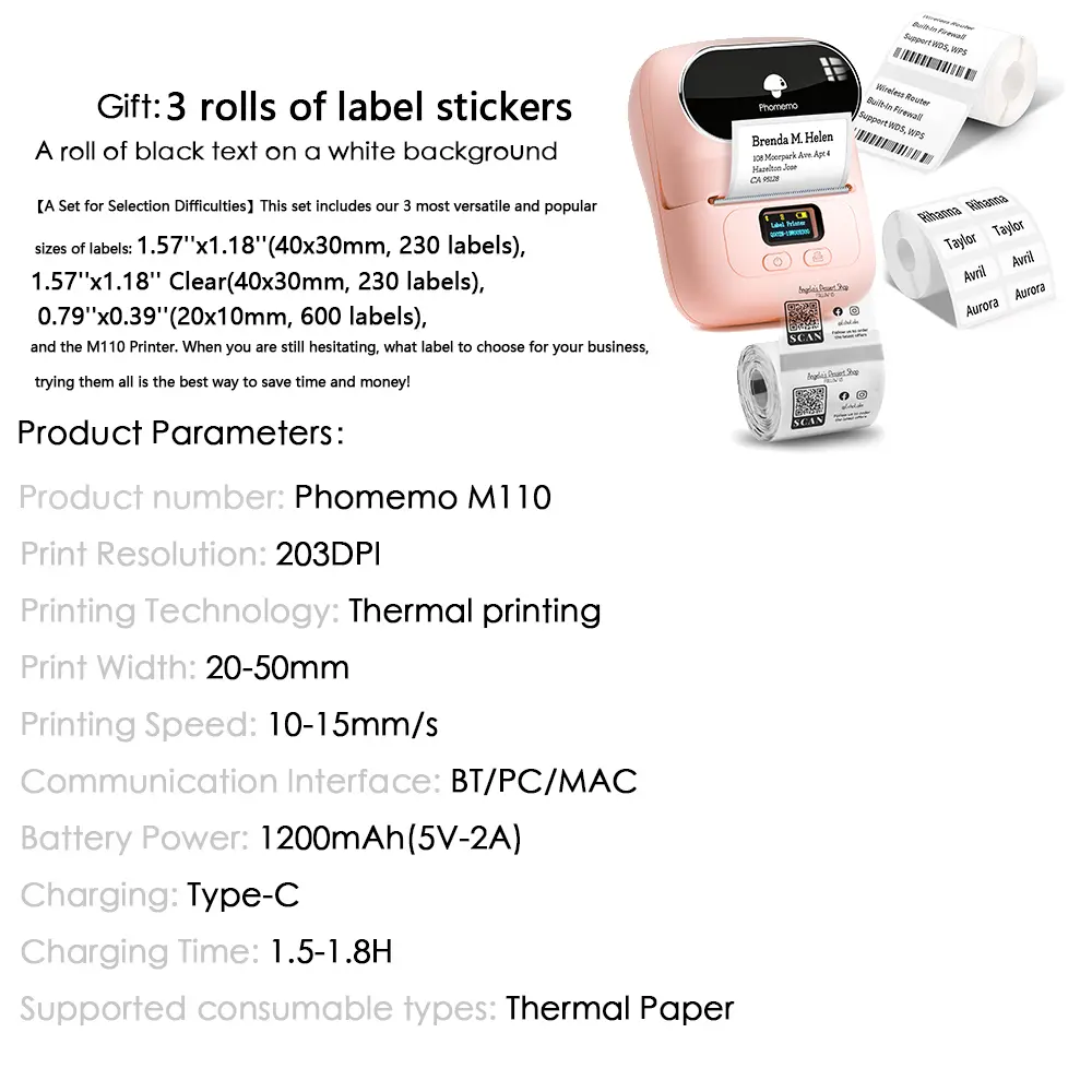 ·【A Set for Selection Difficulties】This set includes our 3 most versatile and popular sizes of labels: 1.57''x1.18''(40x30mm, 230 labels), 1.57''x1.18'' Clear(40x30mm, 230 labels), 0.79''x0.39''(20x10mm, 600 labels), and the M110 Printer. When you are still hesitating, what label to choose for your business, trying them all is the best way to save time and money!