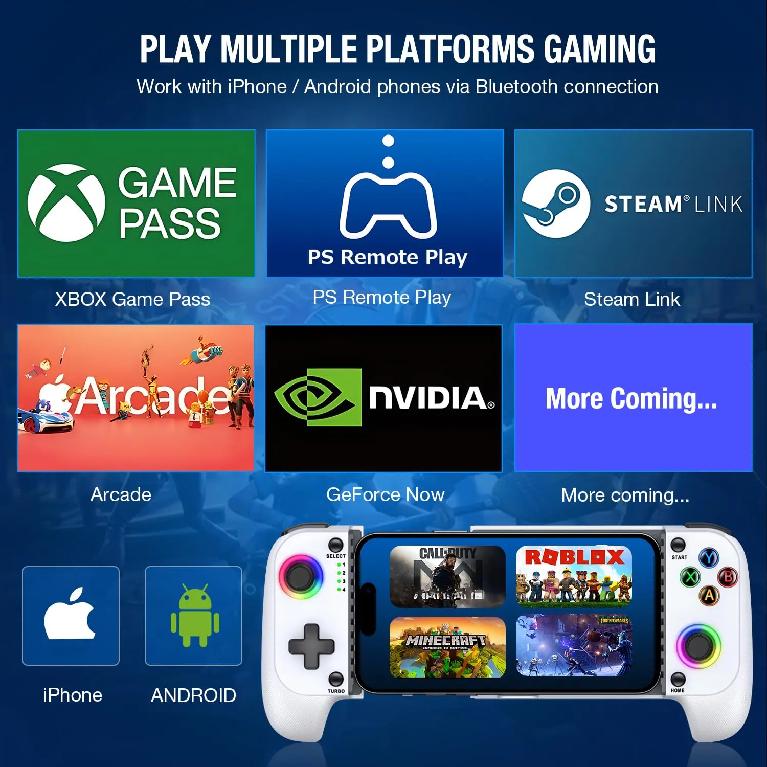 PLAY CONTROLLER ANYWHERE -- Our controller for gaming supports Remote Play, Pass, Steam Link, GeForce NOW, Arcade and other cloud gaming platforms. These handheld controllers for gaming allow you to interact more with your phone and play multiple like , , Call of Duty, Roblox and more anytime, anywhere, with anyone
