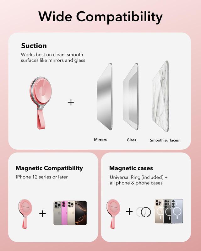 This magnetic phone suction grip is designed for iPhone 17, 16, 15, 14 Android, S25, TikTok, video, and selfies. It's a hands-free mirror phone holder that offers convenience and style. The silicone suction cup ensures a secure fit on any smooth surface. Perfect for those who value both functionality and portability.