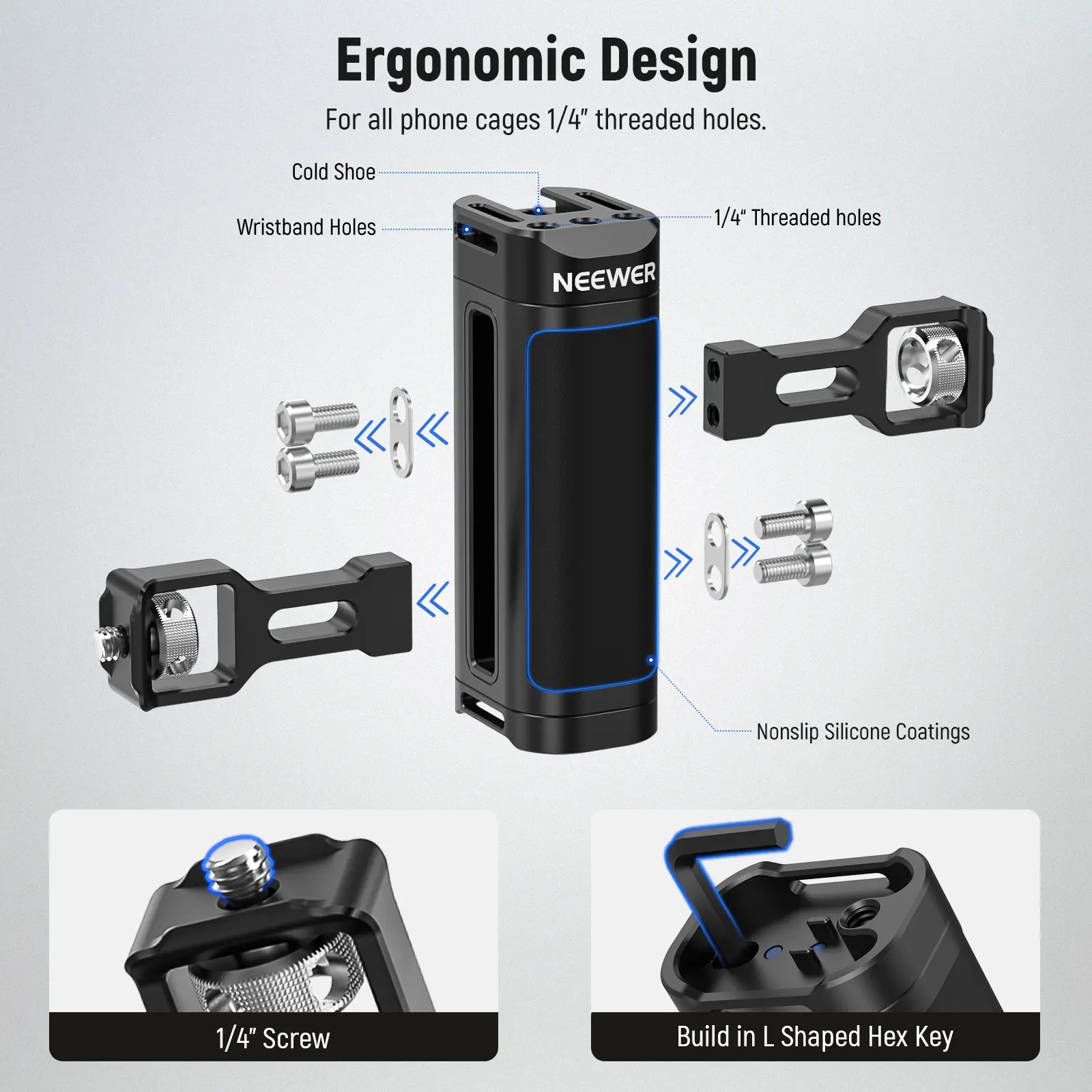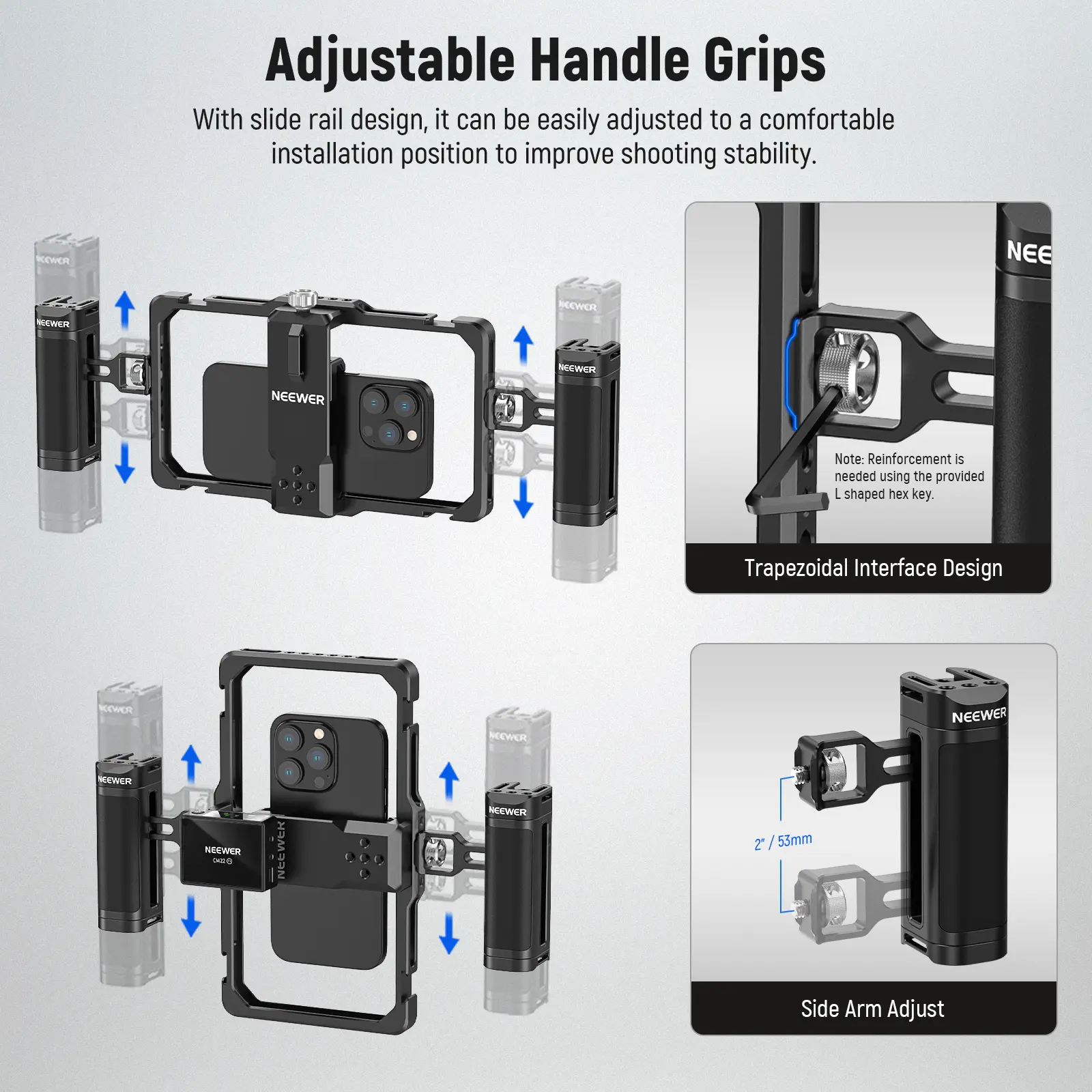 ·Ergonomic Handheld Design- Dual handles are secured to the cage by thumbscrews with a trapezoidal interface design for maximum stability, and the foam coating provides you with a stable and comfortable handheld operation. Use the L shaped hex key to secure the handles or adjust their positions upwards or downwards for optimal grip(PA005E side grip with Bluetooth wireless shutter release is sold separately)