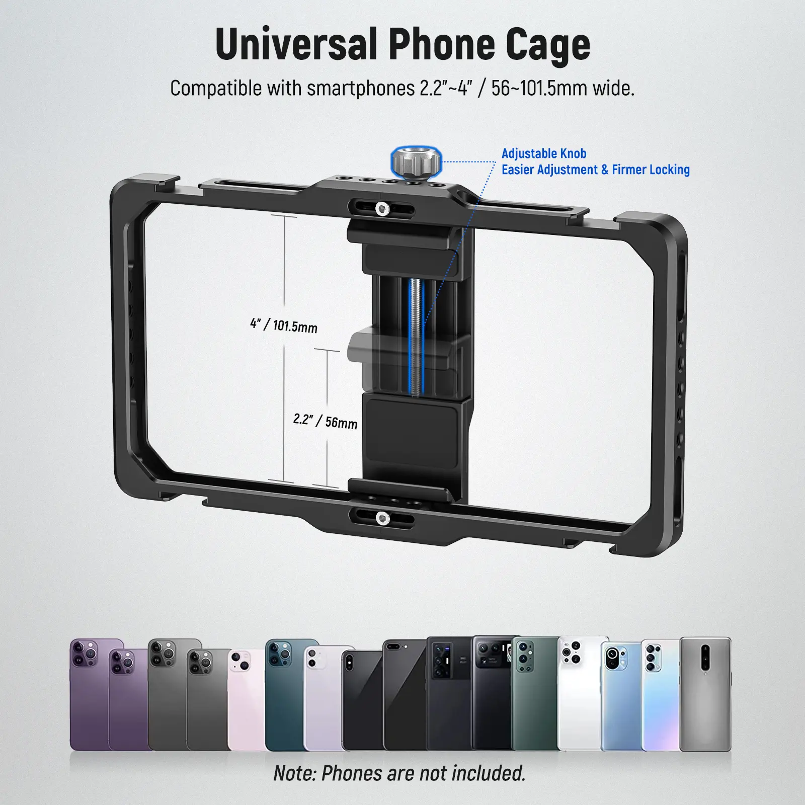 ·Enhanced Universal Phone Cage- Adjustable from 2.2" to 4" (56 to 101.5mm), the inbuilt upgraded anti drop phone holder with a fixing knob is compatible with iPhone 15 14 13 12 11 X iPhone 14 Pro 13 Pro 12 Pro 11 Pro iPhone 14 Pro Max 13 Pro Max 12 Pro Max Samsung Galaxy S23 S22 S23 Ultra Pixel 7 Pro and mostsmartphones on the market. Positions of the phone holder are laterally adjustable