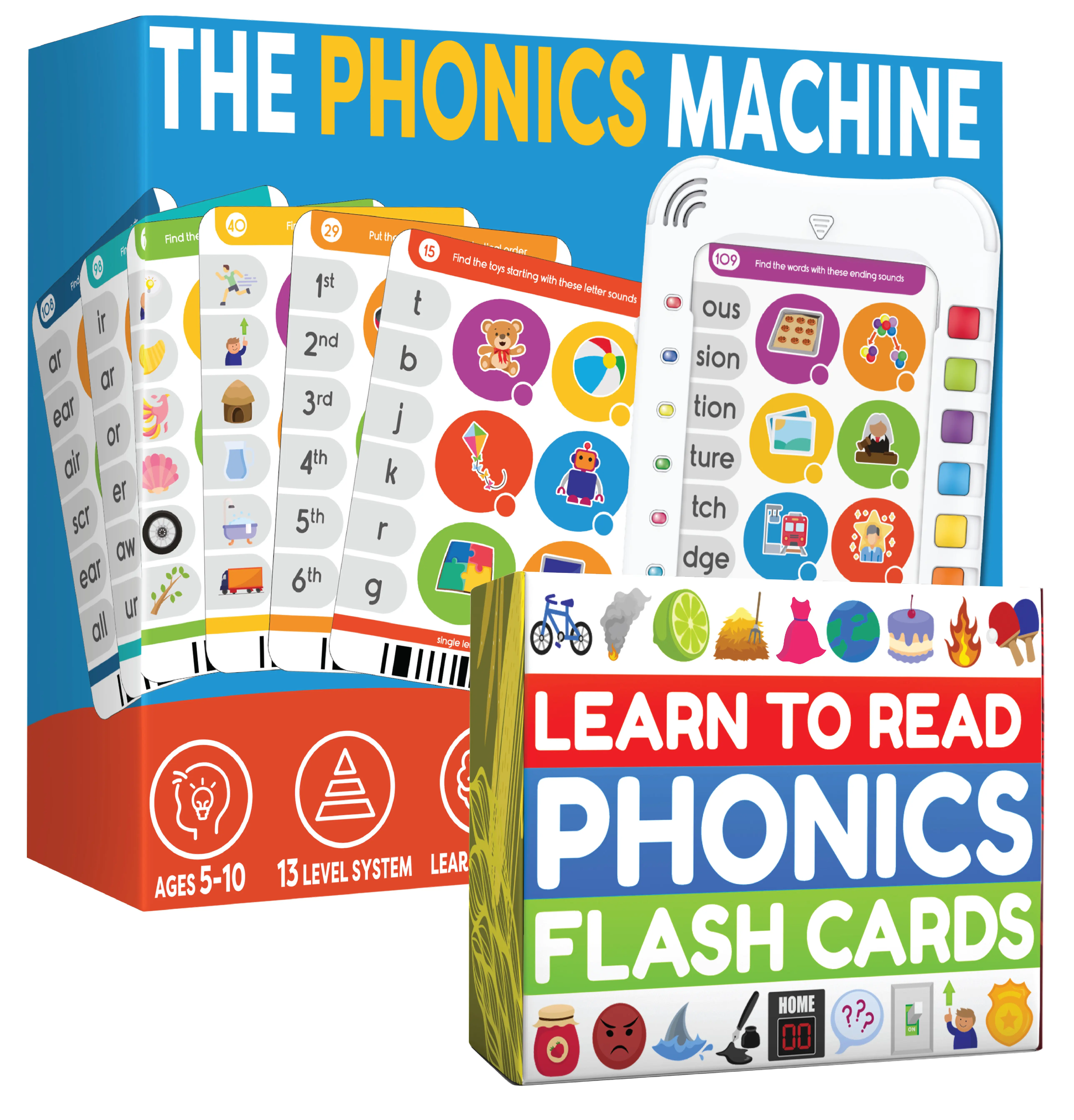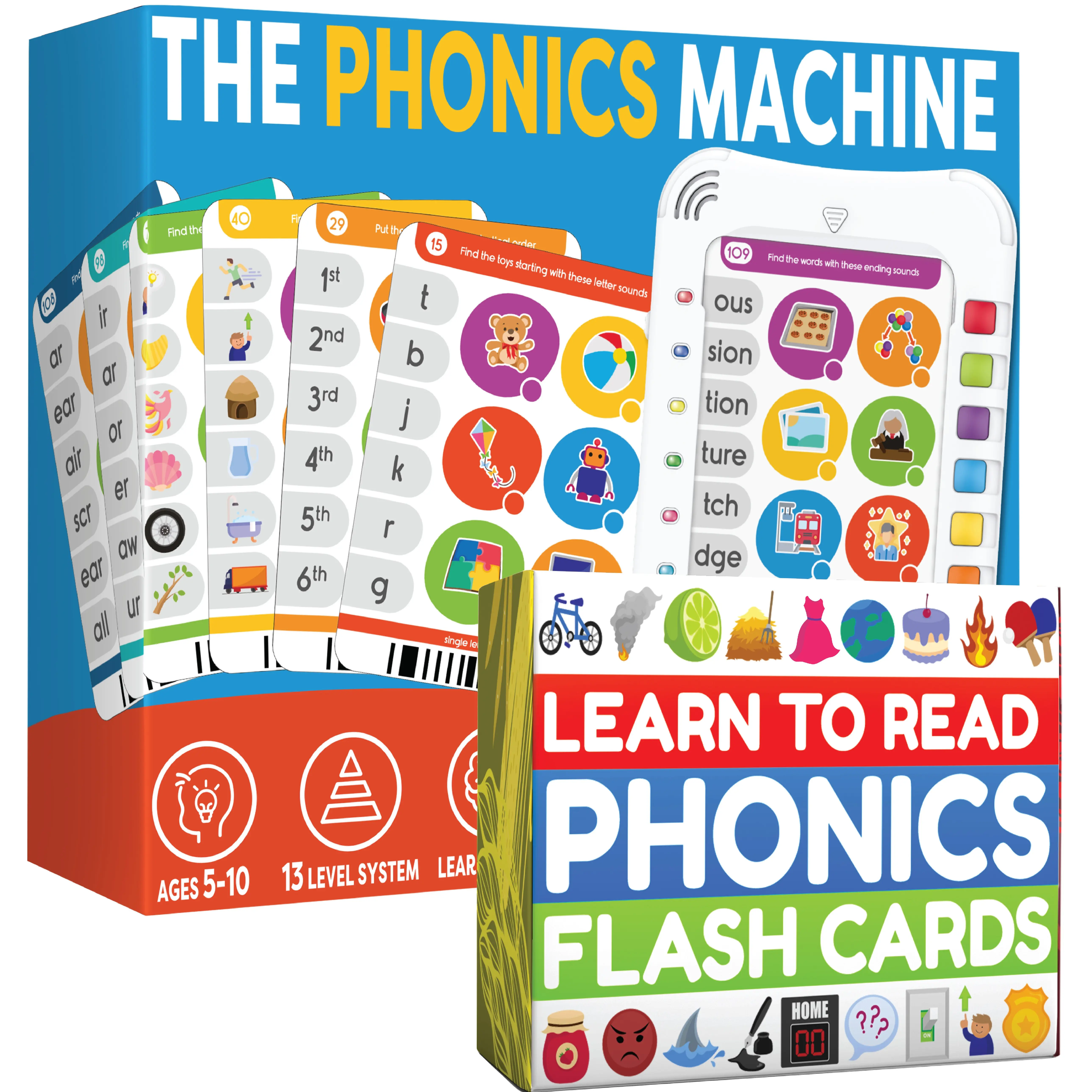 1 x Phonics Learning Machine Pad contains Electronic Audio Pad with 13 Learning Levels split over 60 double sided cards with 720 questions. 9" x 7" pad