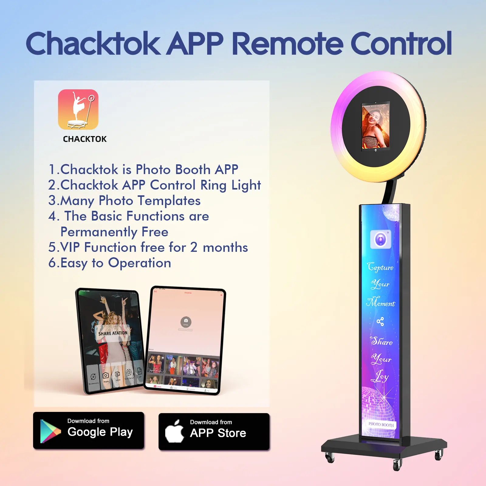 Our photo booth comes with the Chacktok App (2-month VIP trial included). Create custom photo templates, add filters, and connect wirelessly to printers for instant photo printing—all from your iPad.