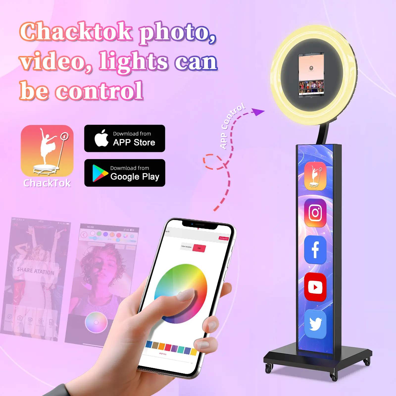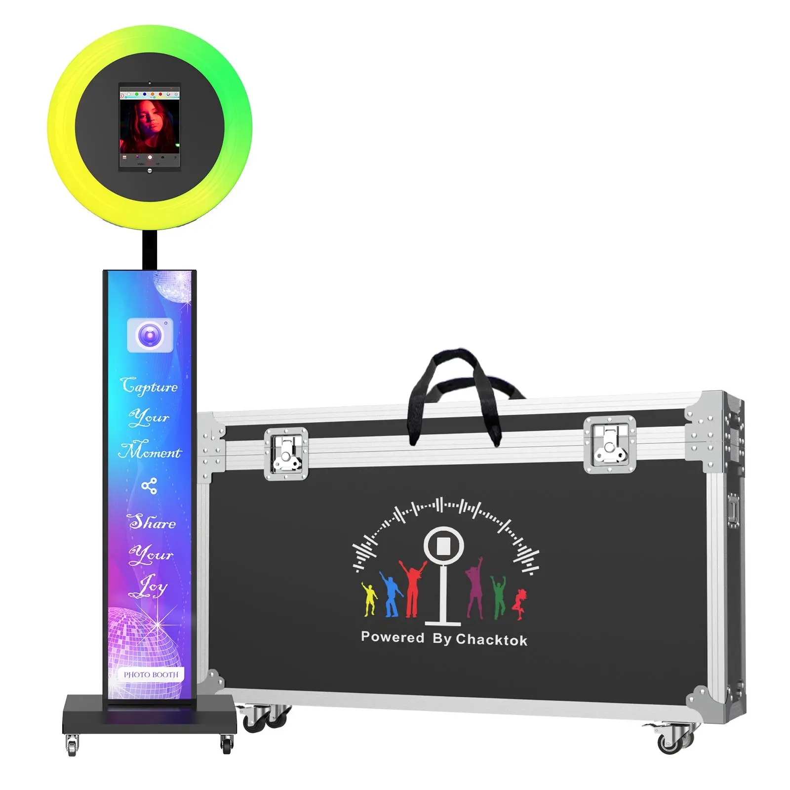 Our photo booth comes with the Chacktok App (2-month VIP trial included). Create custom photo templates, add filters, and connect wirelessly to printers for instant photo printing—all from your iPad.