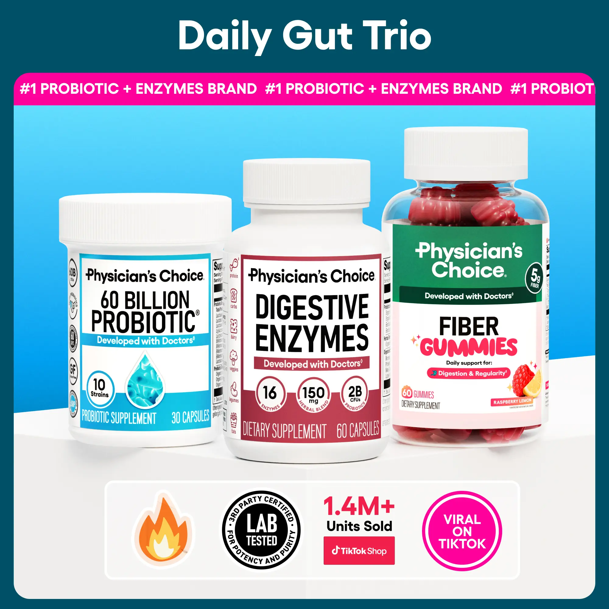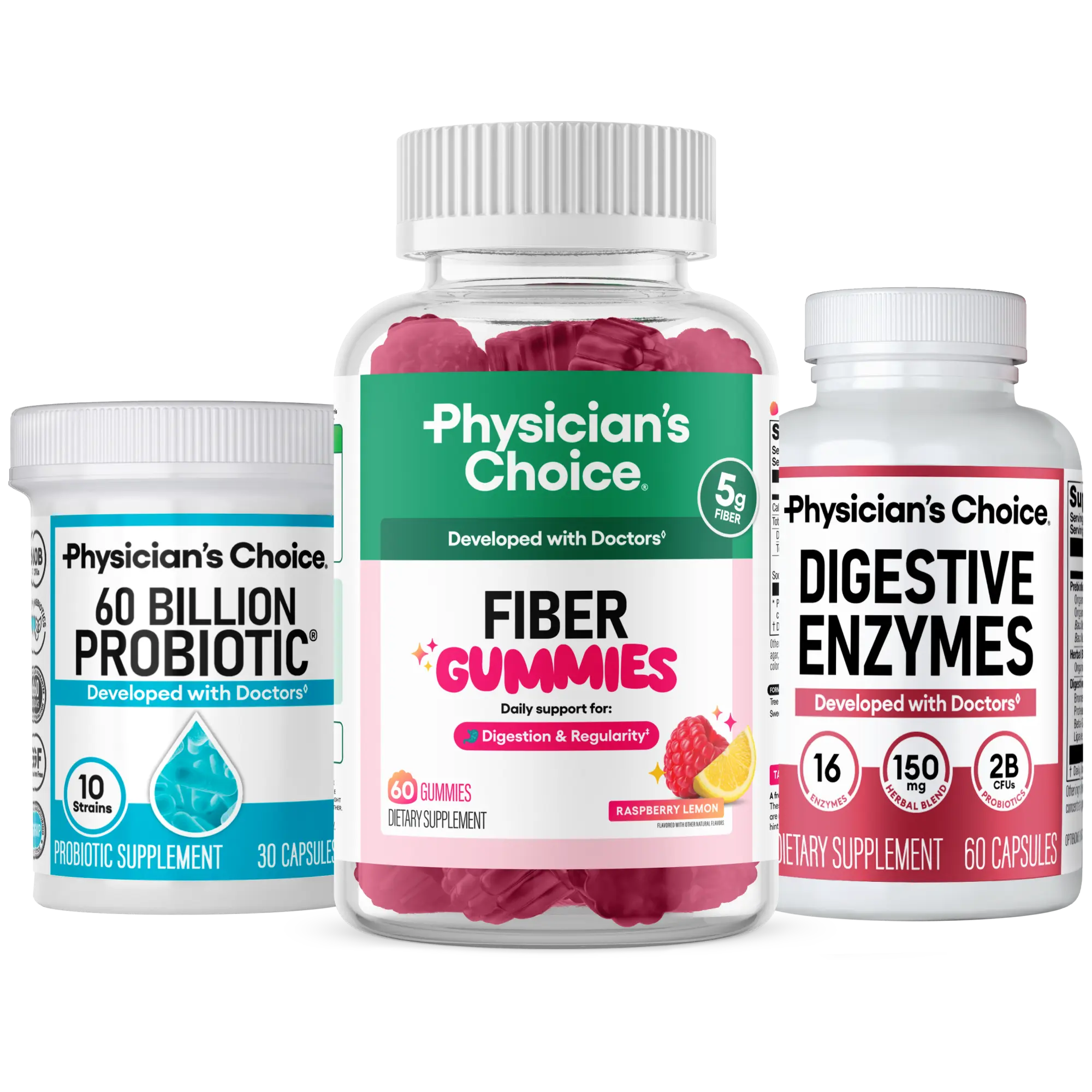 Physician's Choice Daily Gut Trio bundles Fiber Gummies, Digestive Enzymes, and 60 Billion Probiotic for daily digestion, regularity, and gut health support, plus additional mealtime comfort.