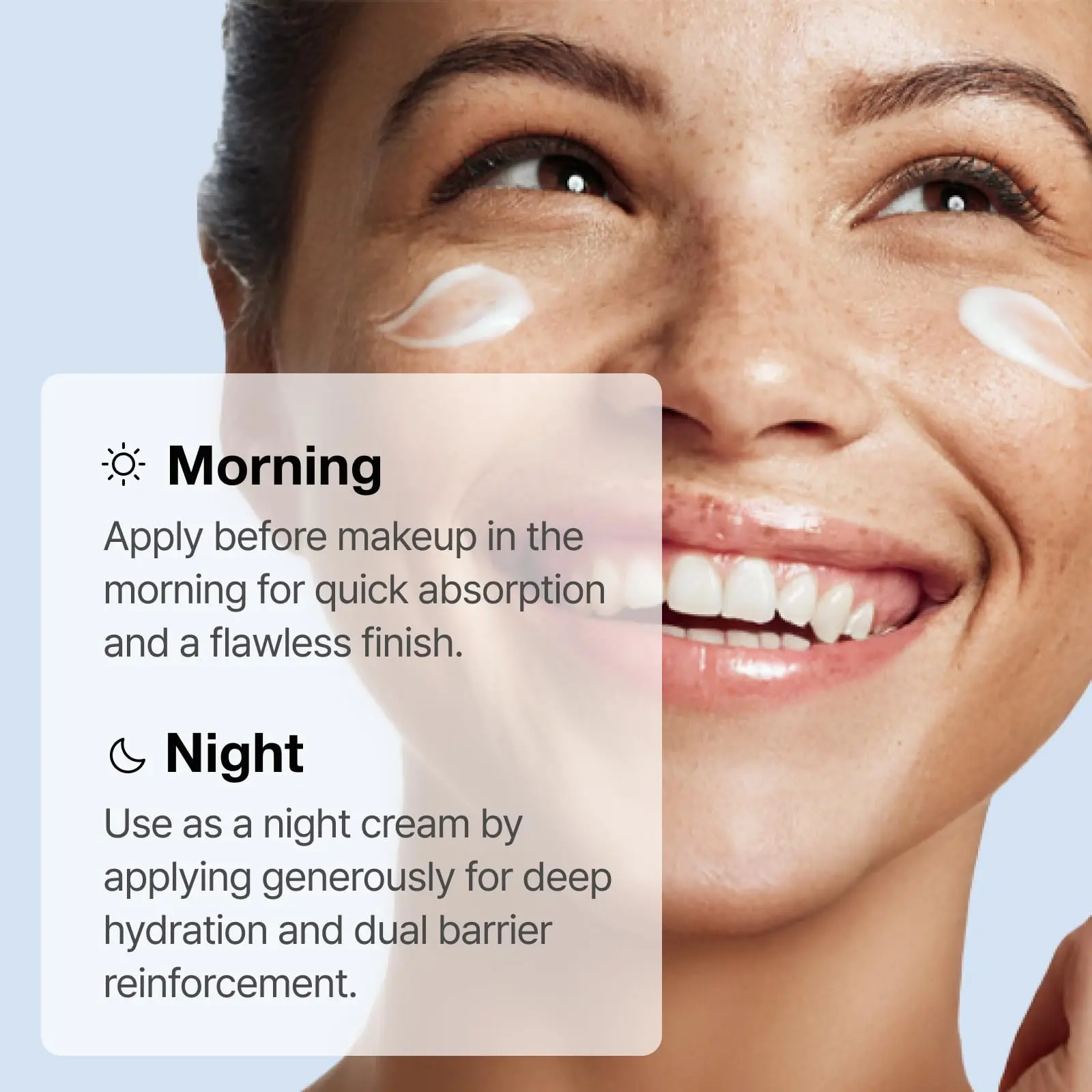 [Glow All Day and Night] Apply in the morning for quick absorption that preps your skin perfectly for makeup. Use as a night cream for intense hydration and enhanced barrier repair while you sleep.