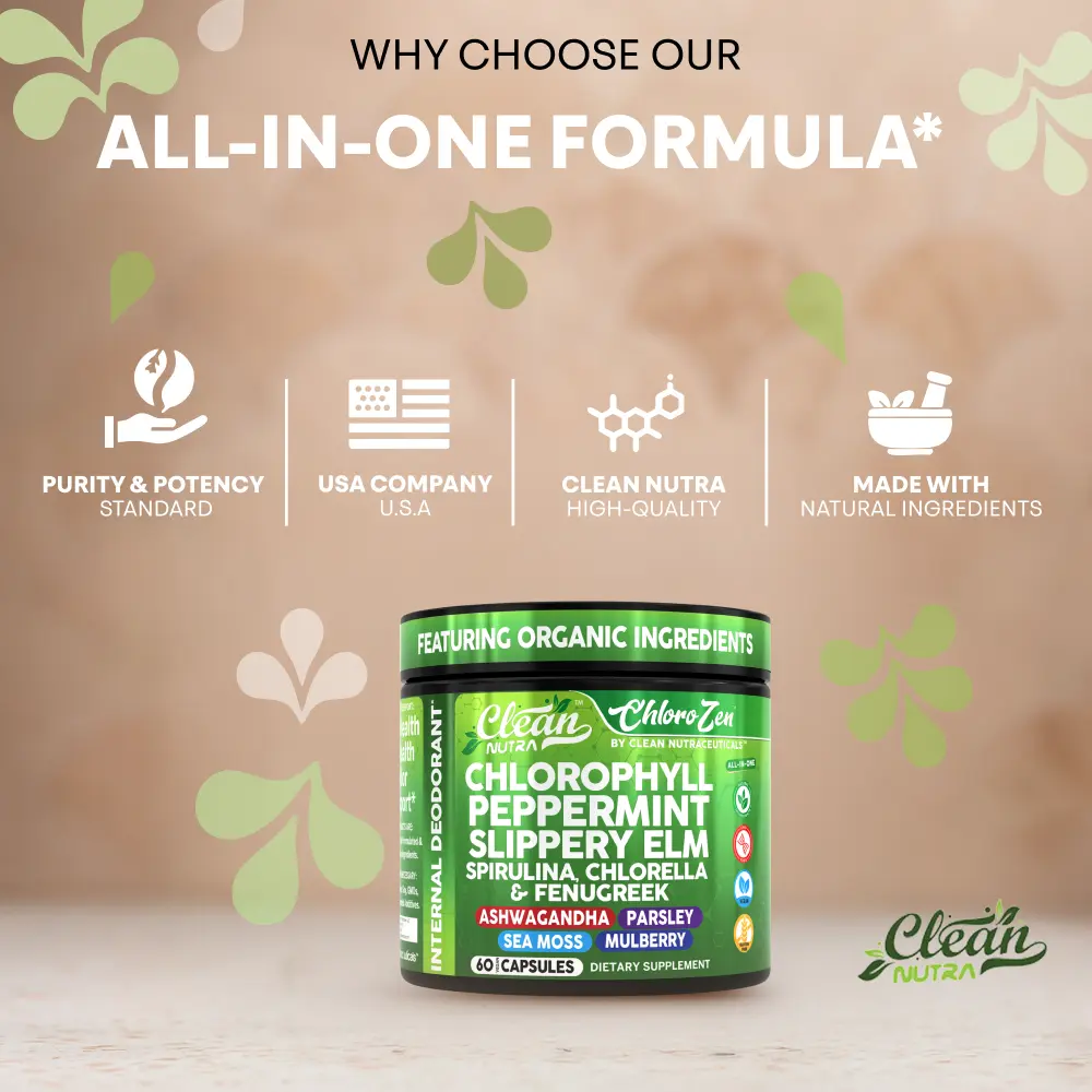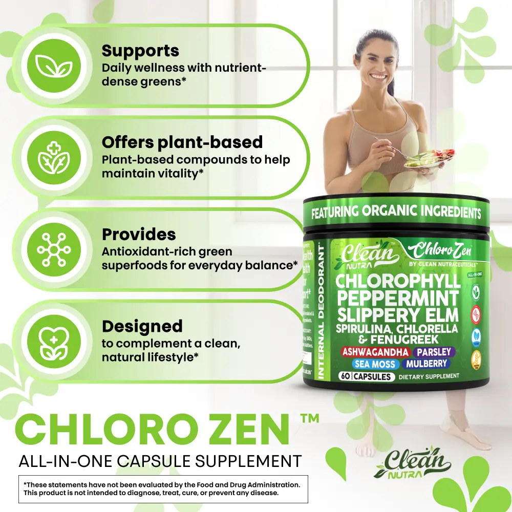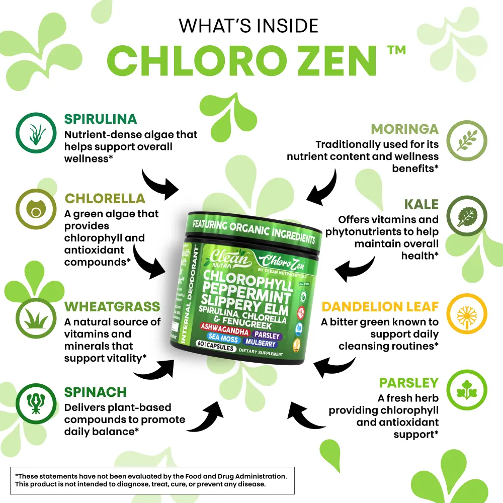 Clean Nutra ChloroZen is your go-to internal deodorant and breath-freshening formula designed to help cleanse, refresh, and balance your body from the inside out.*