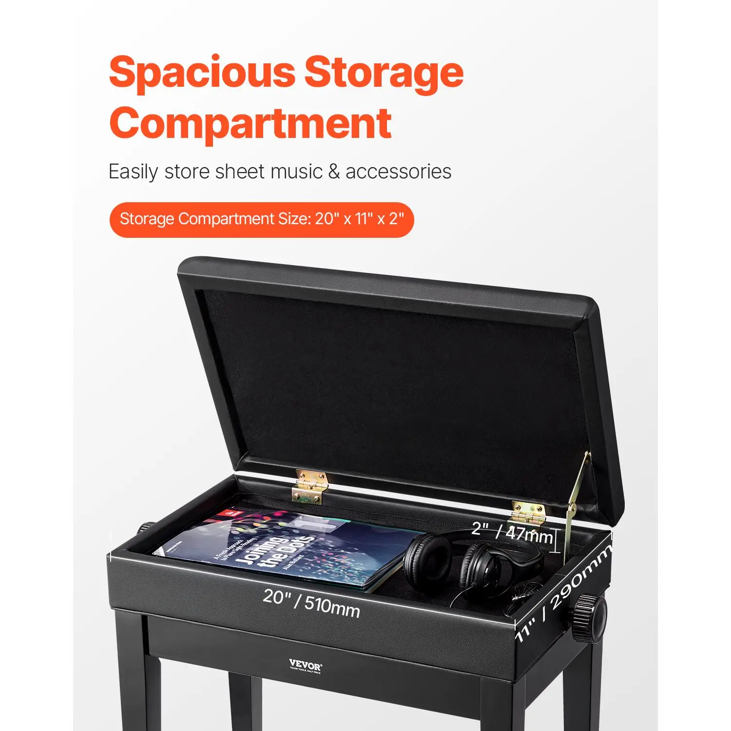 • Ample Storage Compartment: With a roomy 20" x 11" x 2" storage compartment, this piano bench offers ample space to store sheet music, small accessories, or other music supplies. Keep your music space neat and organized while enjoying easy access to all your essentials.