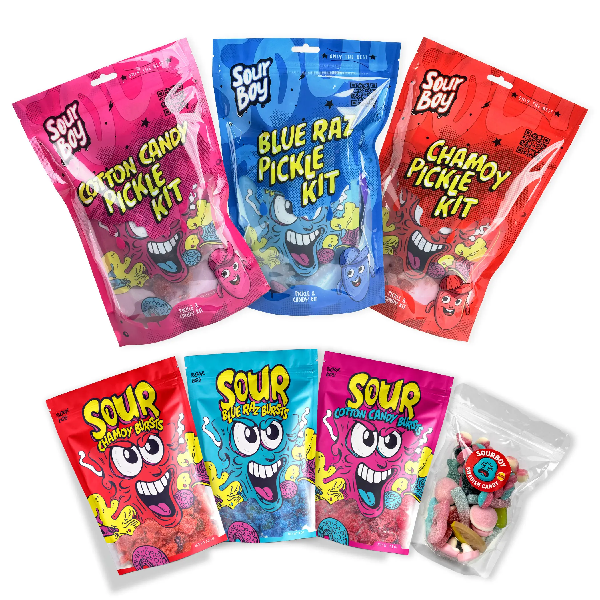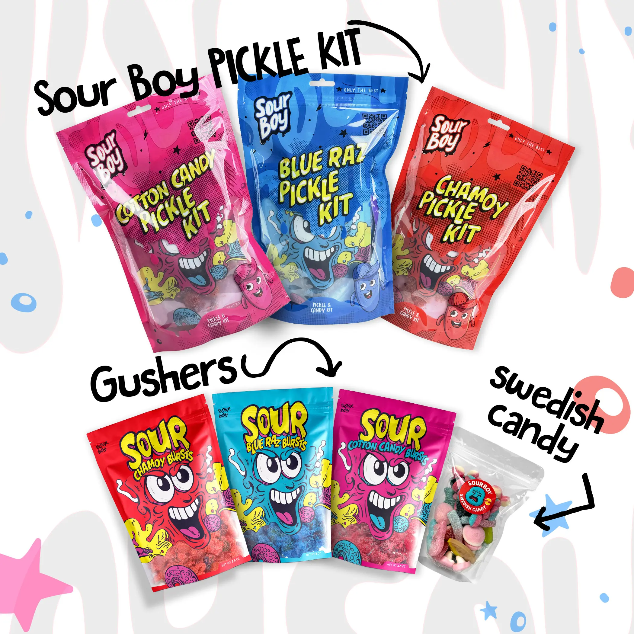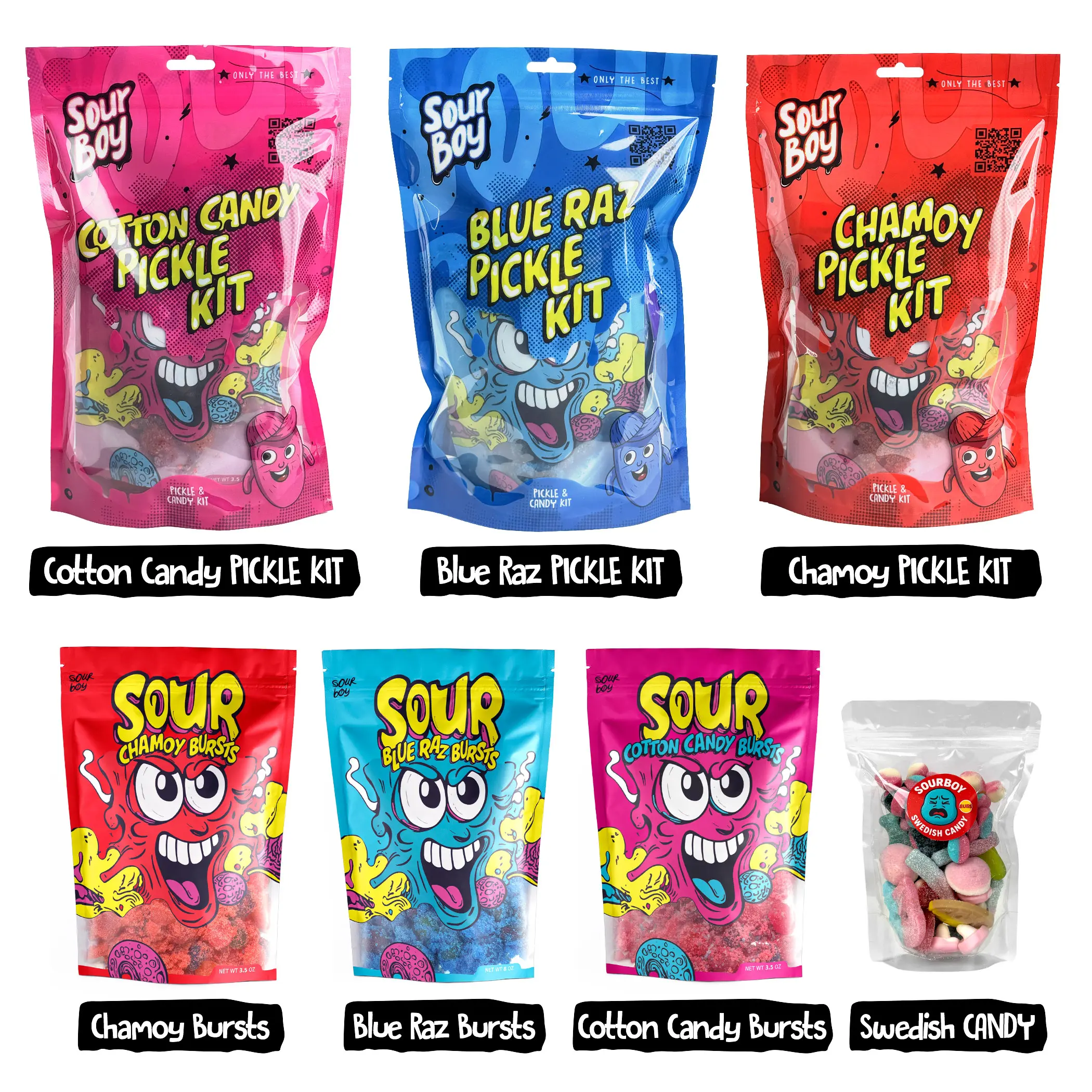 ·Pickle Kits: Includes blue raspberry, cotton candy, and chamoy pickle kits.