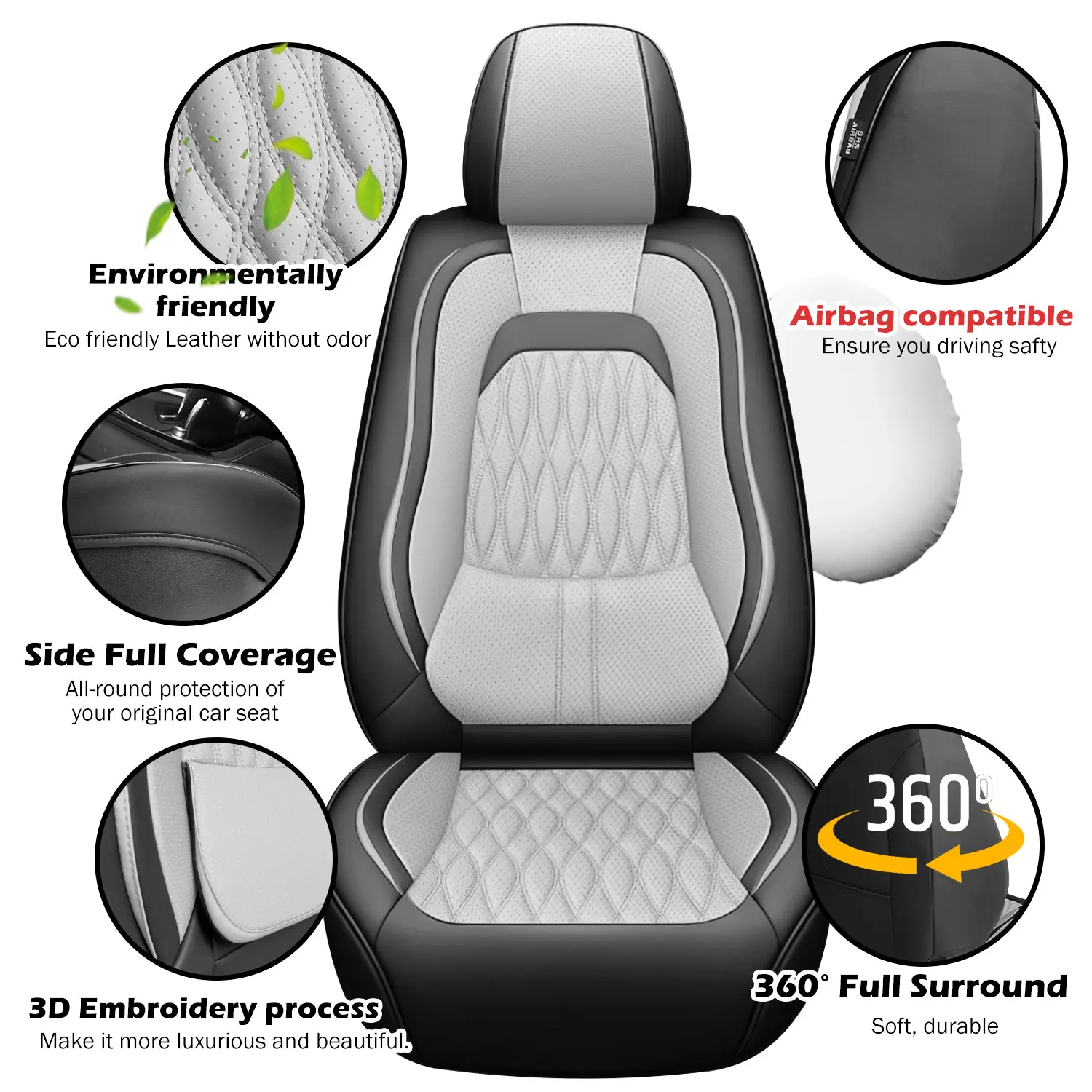【360° PROTECTION】: Unlike other universal car seat covers that only cover the bottom of the seat and the main surface of the backrest, These seat covers wrap around the car seat to provide greater protection and a better look. Fade-proof, stain-proof, dust-proof and waterproof.