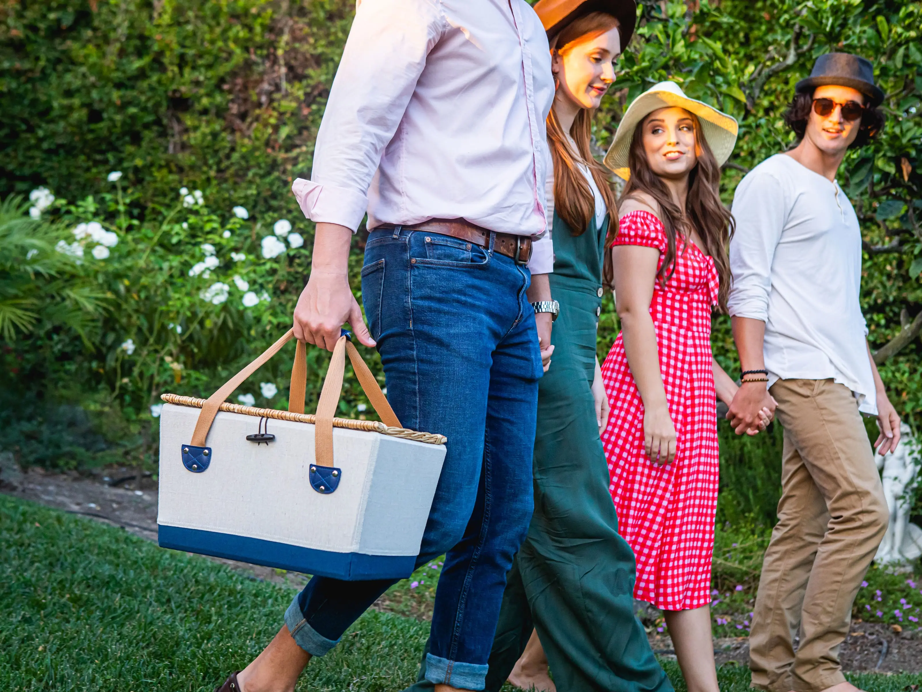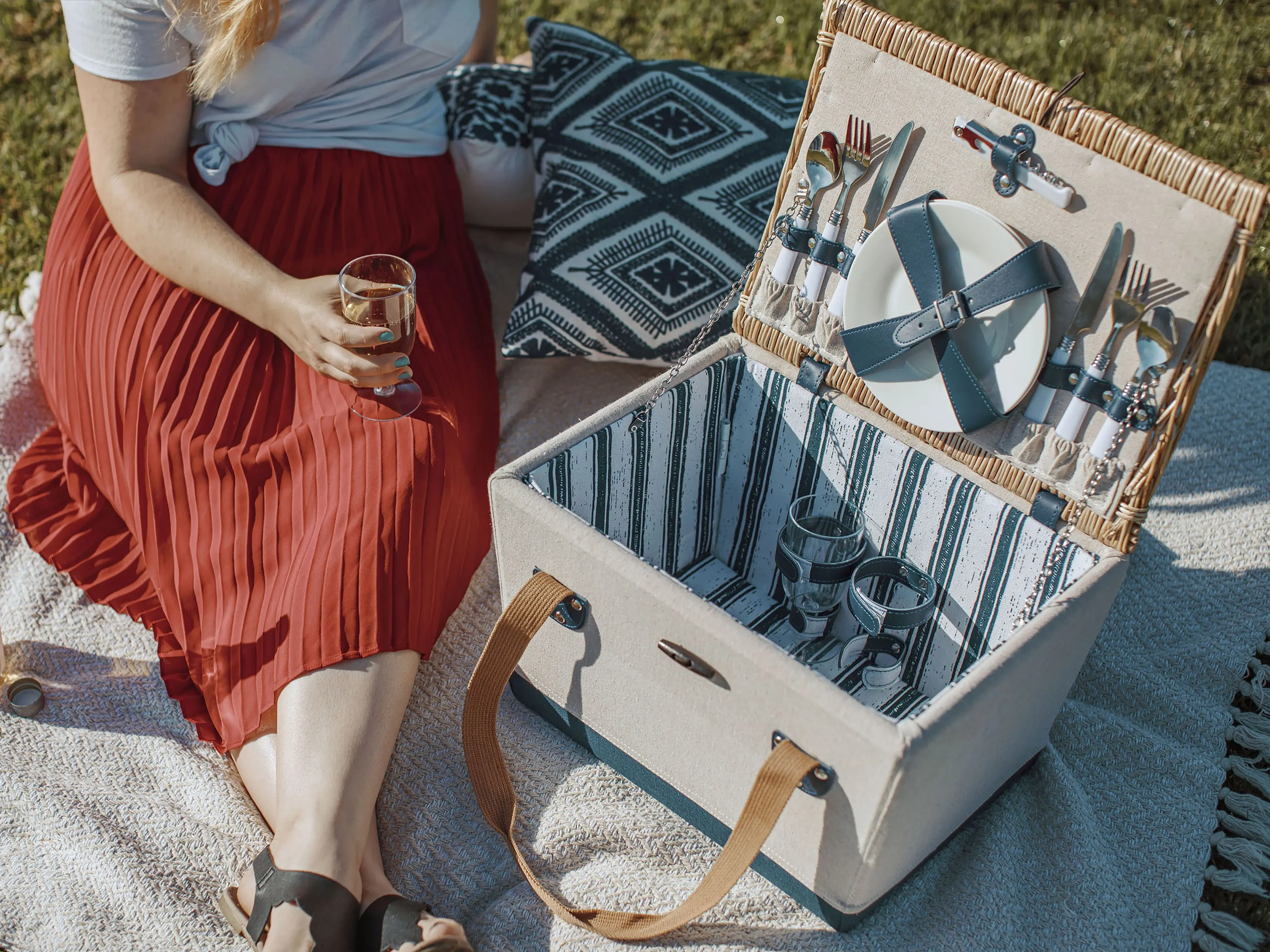 With the Boardwalk Picnic Basket for 2, you're all set for a romantic couple’s wine and cheese picnic. A classic yet modern take on the vintage-chic handwoven picnic basket, the Boardwalk is a small picnic basket that stands out with its unique canvas and wood frame. Unlike most other English-style baskets, it also has a stylish carrying strap and locking mechanism in the lid. Inside, you’ll find a fully loaded picnic and wine service set for two, making the Boardwalk Basket a fantastic wedding or anniversary gift for a lucky couple.