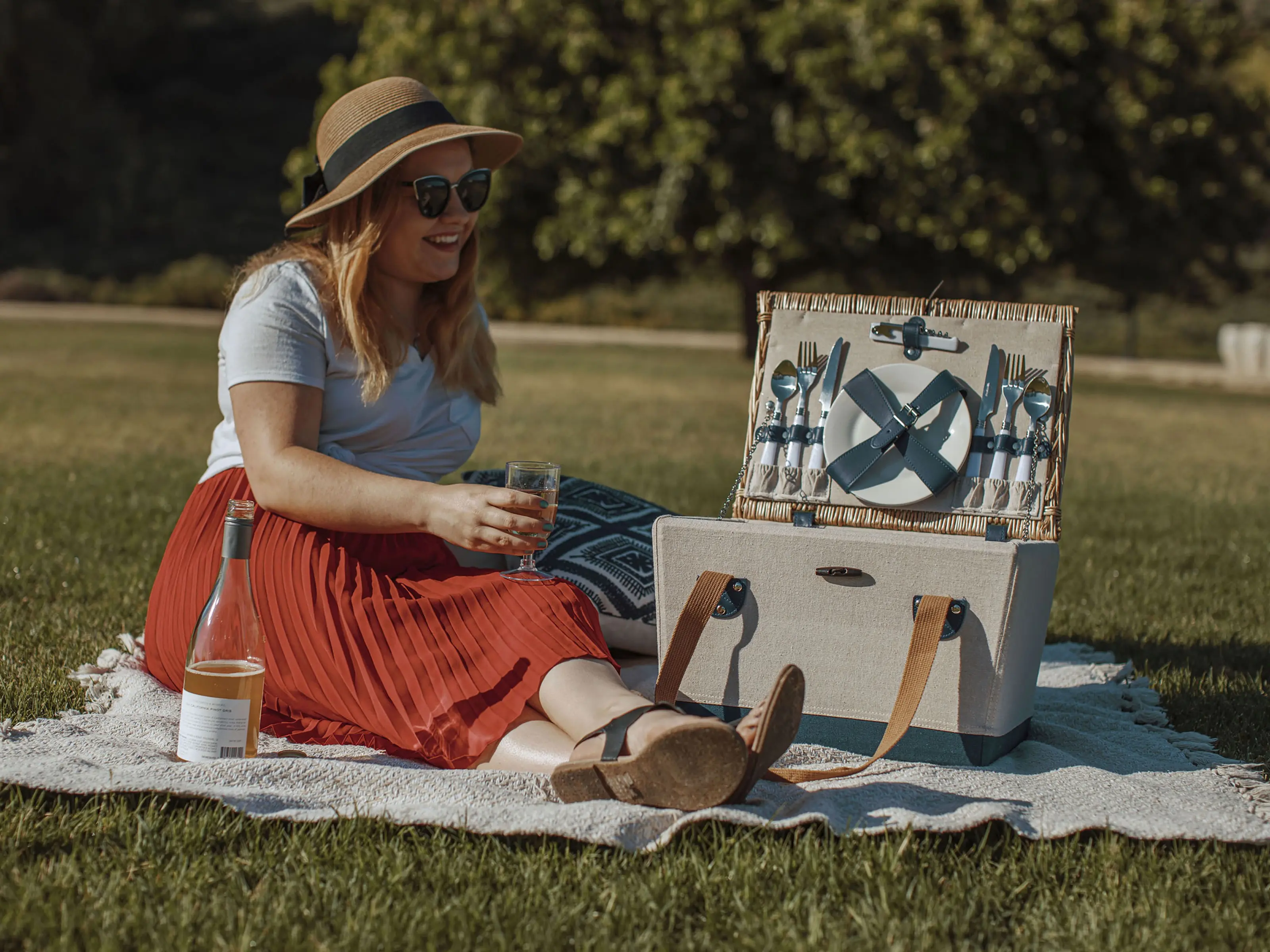 Includes 2 porcelain plates, 2 sets of stainless steel flatware, 2 shatter-resistant wine glasses, and a stainless waiter's corkscrew