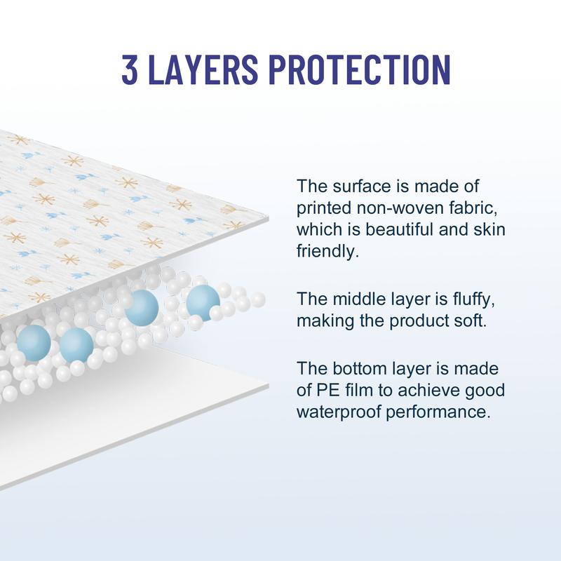 4. Durable Three-Layer Construction: The top layer features a beautifully printed non-woven fabric that is gentle on the skin. The middle layer is fluffy, adding softness to the product. The bottom layer consists of PE film, ensuring excellent waterproof performance and durability.