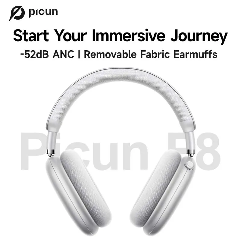Product Overview: Elevate your listening game with the Picun F8 Pro wireless headphones, delivering an unmatched audio experience. Featuring industry-leading 52dB active noise cancellation (ANC) and head-tracking technology, plus 5 ENC noise-canceling mics and detachable fabric ear cups for all-day comfort. Customizable sound profiles keep you focused and efficient during work, travel, or downtime. With up to 120 hours of battery life and seamless dual-device connectivity, it's your go-to for productivity and play.