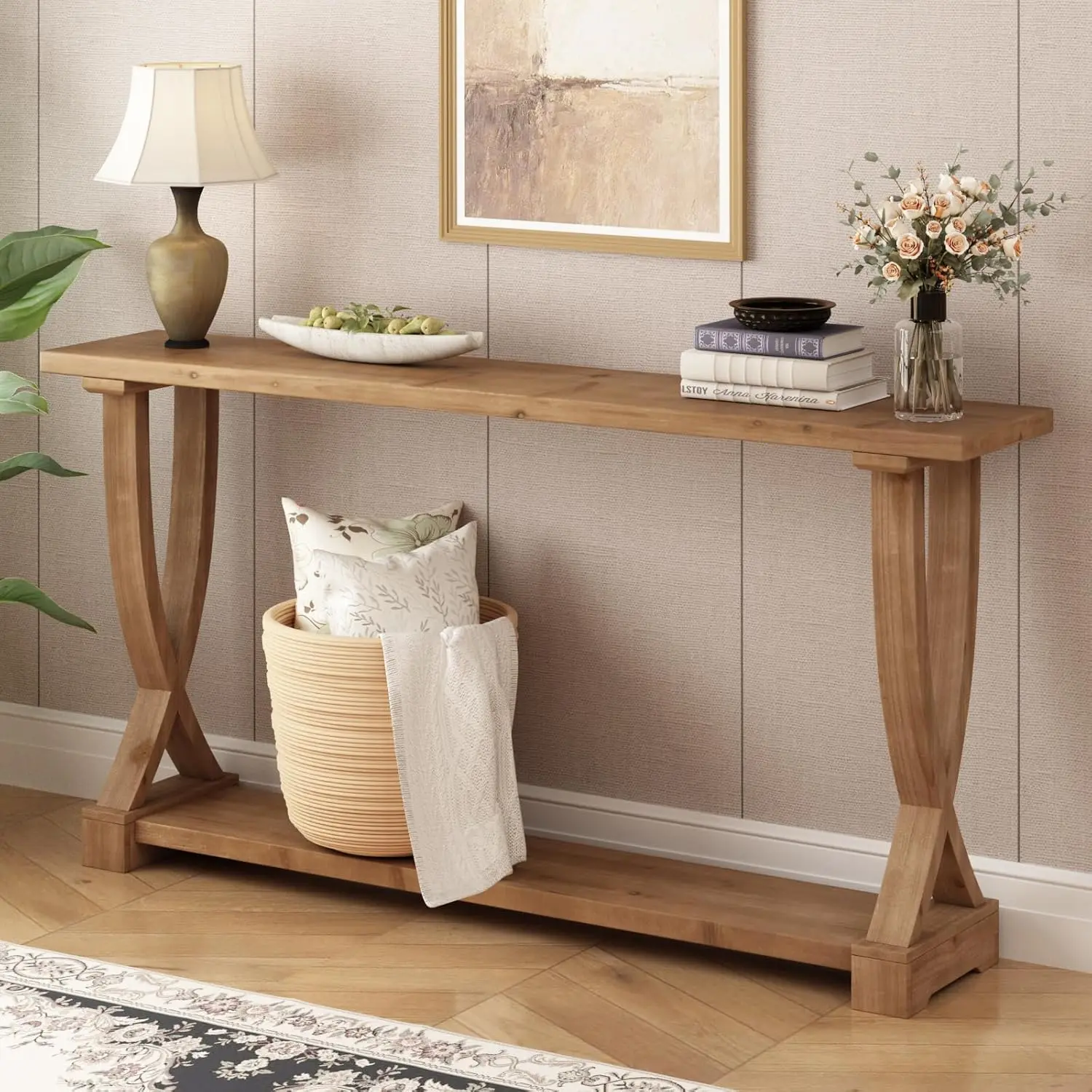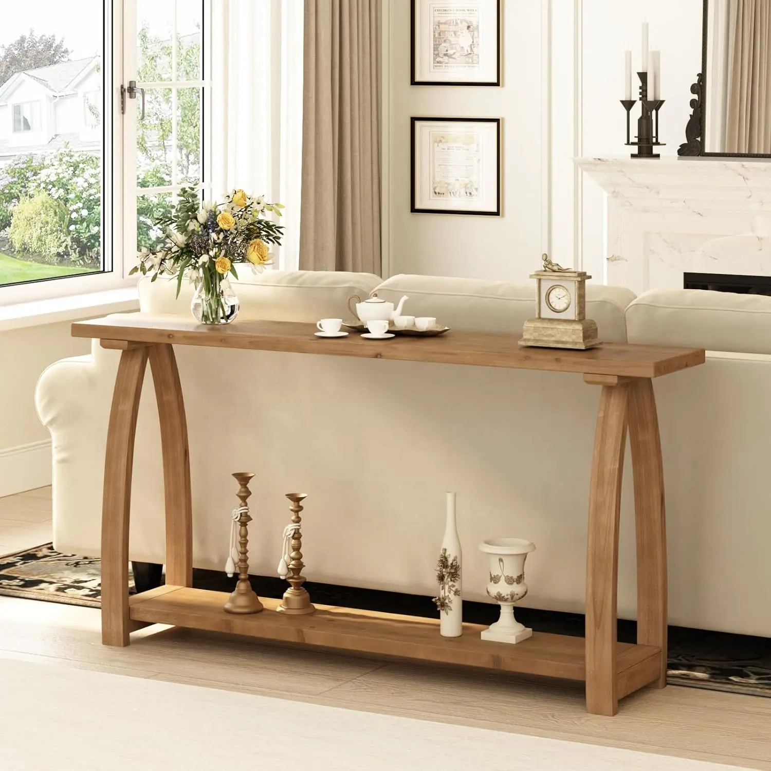 ·Spacious Open Storage Shelf | Measuring a generous 63 inches long, this large console table offers ample surface and practical open storage below. The bottom shelf is perfect for organizing living room essentials, farmhouse décor baskets, books, or entryway items—combining stylish design with smart storage in one modern piece.