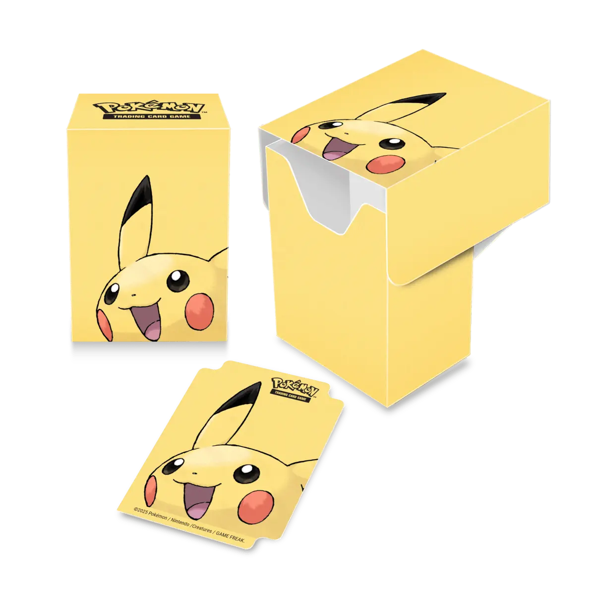 Full View DECK BOX® card storage containers for Pokémon feature vibrant, full-color artwork of Pikachu and include one matching deck divider. Made with archival-safe, non-PVC, rigid polypropylene materials, these deck boxes can store up to 75 double-sleeved cards comfortably. The self-locking lid keeps your cards securely stored when not in use, while also offering easy deck access. Fits standard size trading cards.