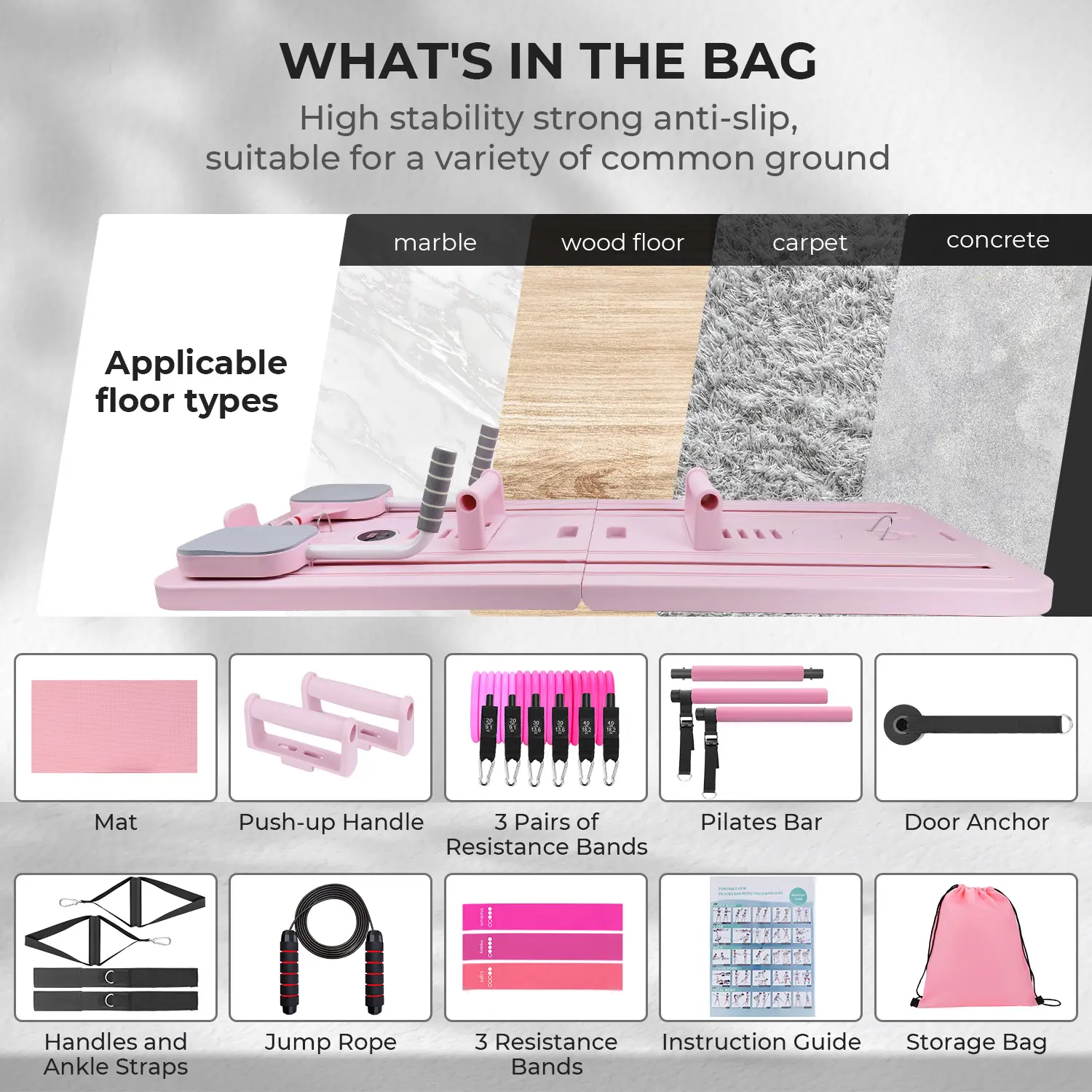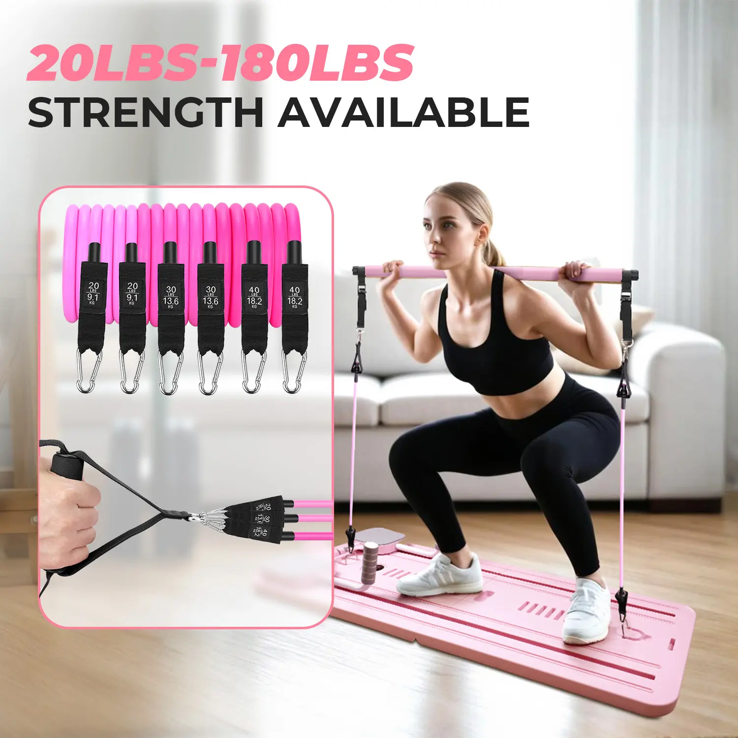 MULTIFUNCTIONAL PILATES ACCESSORIES: Our multifunctional pilates board comes with pilates bar and 3 pairs of resistance bands (20lbs, 30lbs and 40lbs respectively), 3 resistance bands for leg and a jump rope, this diverse combination of pilates fitness accessories and resistance bands allows you to experience the most comprehensive workout at home, with a wide range of resistance to choose from, to maximize the effectiveness of your workout.
