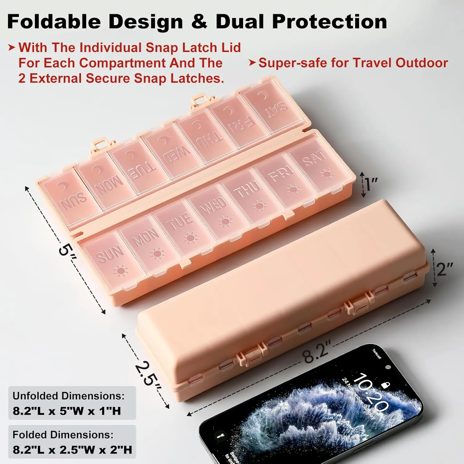 ·★FOLDING DESIGN & DUAL PROTECTION - This 2 times a day weekly pill box features the most stylish foldable design, with the day and night compartments combined by folding.The medications in each compartment are protected by the inner lid first, and then all the am & pm compartments are brought together tightly by the external snap closure locks.Dual protection keeps medications safer from spills while on the go.