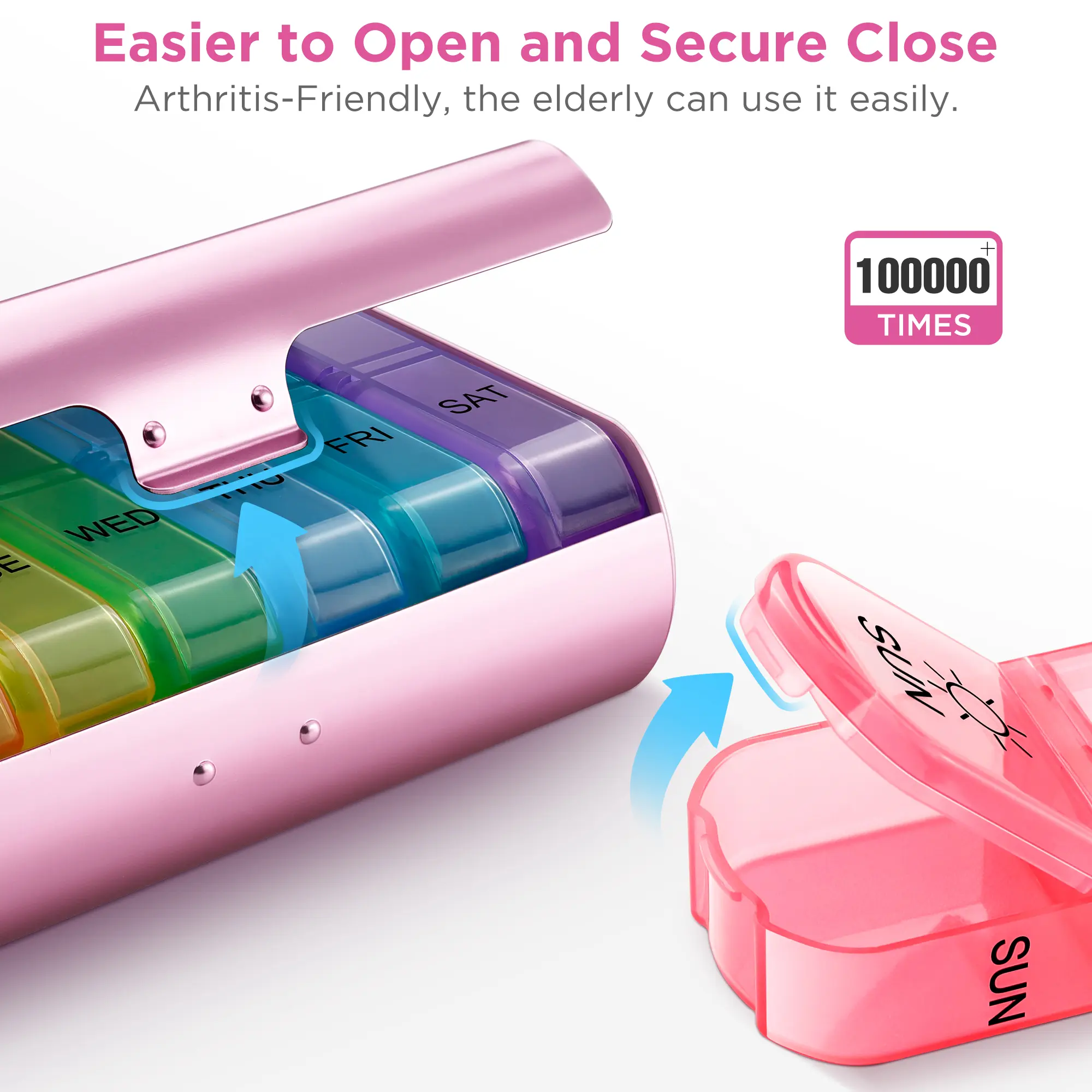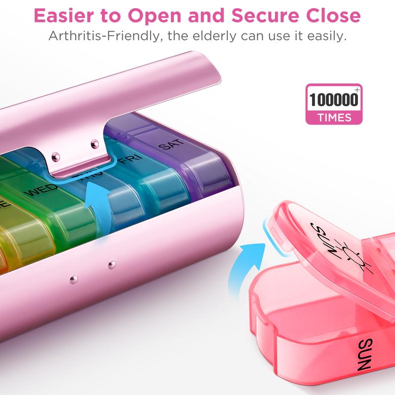 ·Long-lasting Design: Unlike other cute pill holder on the market, this vitamin organizer features an upgraded outer hinge with a built-in steel pin for enhanced longevity and reliability. The hinge can withstand over a million uses without the pin not falling. The medication organizer letters are UV printed, lasting over 10,000 uses, never worry about the rub-off labels.