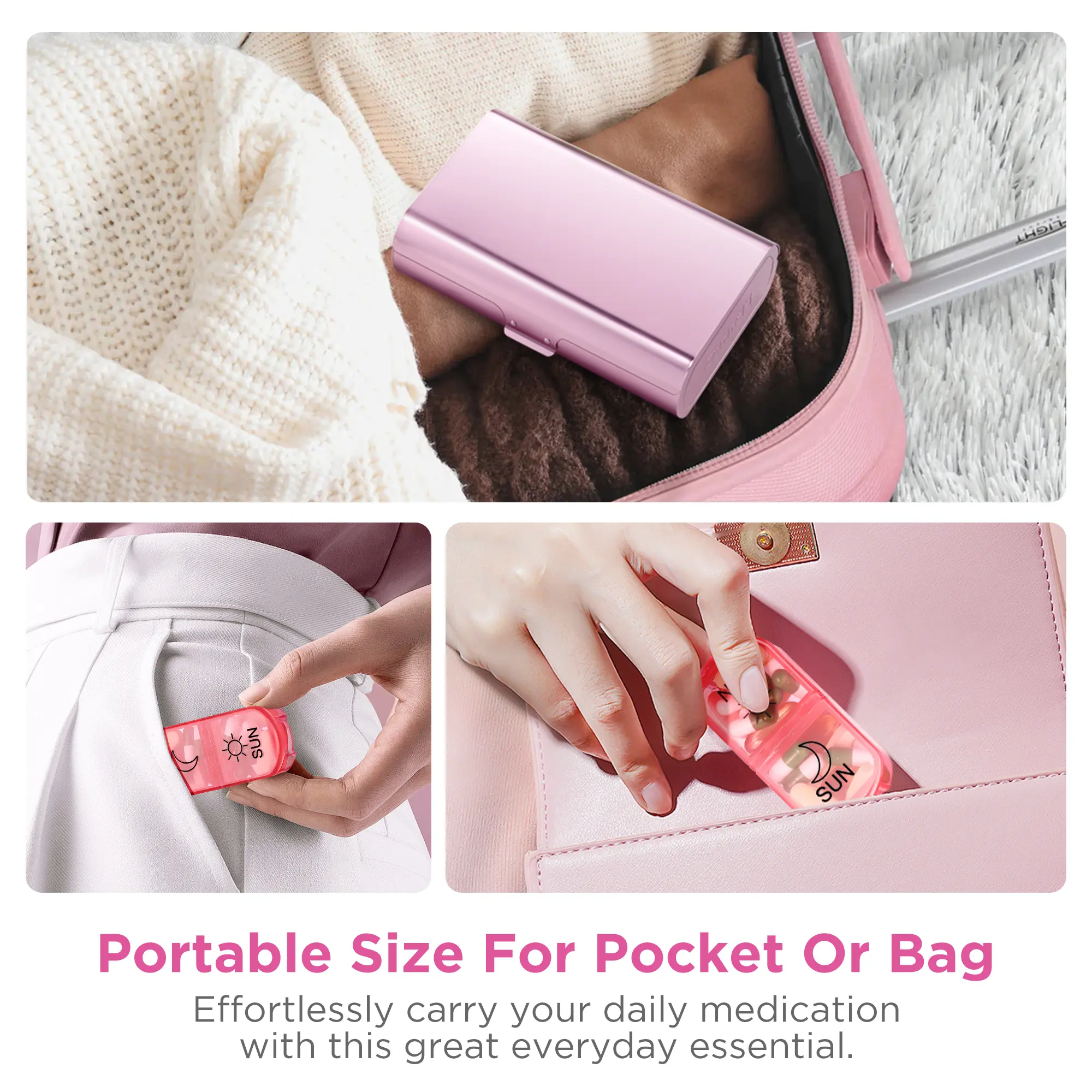 ·Easy to Use & Portable: This medicine pill organizer features clever design with prominent lid edges, a spacious opening, and easy operation, making medication retrieval very convenient. even for elderly or arthritis patients. Each day's pill case fits neatly into your wallet or pocket, and the metal casing of the morning and night pill boxes not only protects your medication privacy but also allows for a week's worth of pills to be carried during travel.
