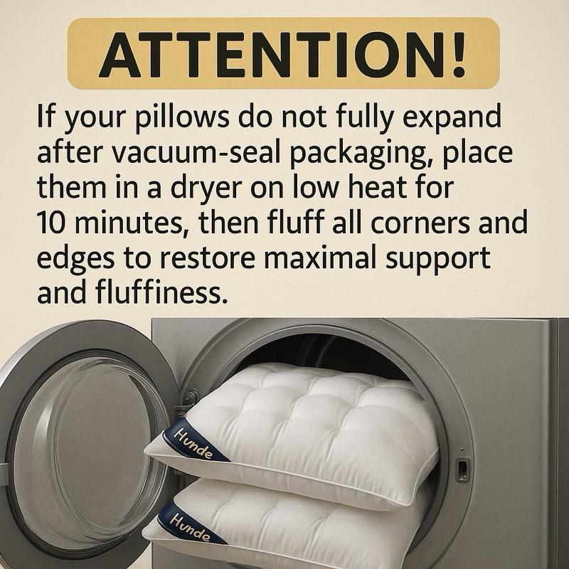 ATTENTION: If your pillows do not fully expand after vacuum-seal packaging, place them in a dryer on low heat for 10 minutes, then fluff all corners and edges to restore maximal quality, support, and fluffiness.