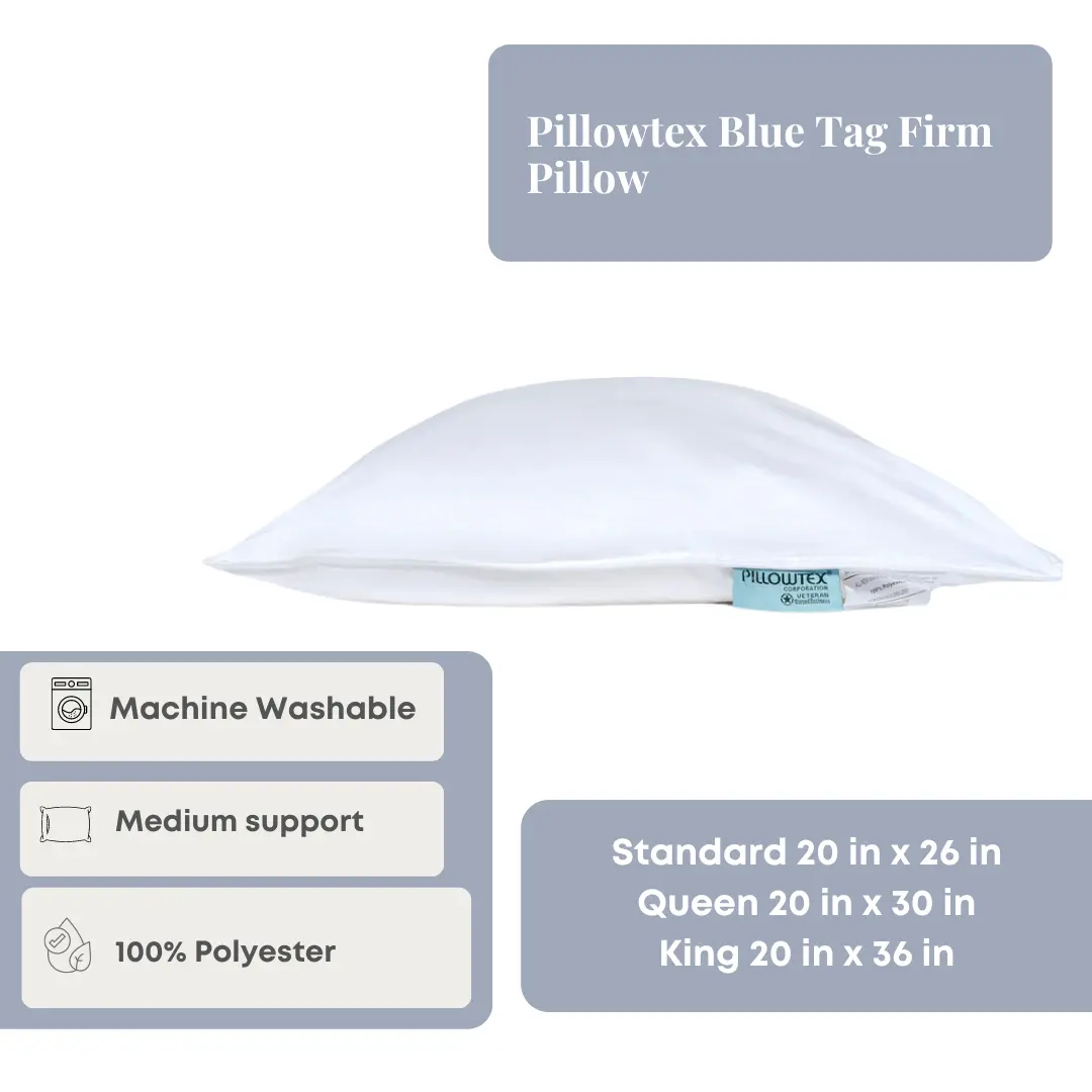 Pillowtex® Blue Tag Firm Pillow is inspired by the Blue Label Pillows by Choice Hotels. Designed perfectly for firm pillow lovers, this pillow is filled with down-like polyester fiber that compresses at touch. These pillows are prefect for side and back sleepers who perfect their pillow to not fall flat during the night! Get this pillow today for a better night sleep tomorrow! Manufactured by: Pillowtex® Fill: 100% Polyester Size: Standard (20 in x 26 in), Queen (20 in x 30 in), King (20 in x 36 in)