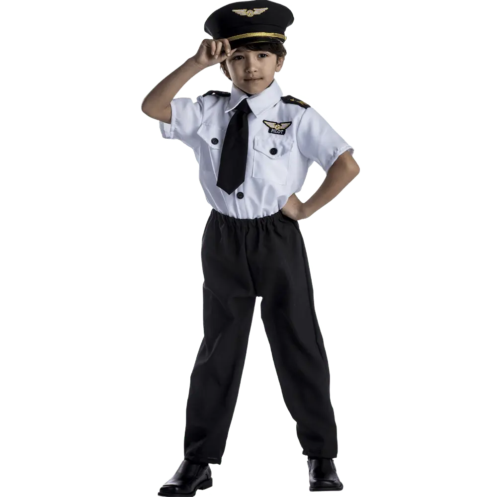 FLY TO NEW HEIGHTS WITH THIS AWESOME PILOT COSTUME! This costume will have your little one flying high! See him dress like his hero and dream. The white short sleeves uniform style shirt has 2 pockets and an attached necktie. The shirt is designed with epaulets, black buttons down the center and on the pockets, and the pilot insignia embroidered. Also included in the set is a pilot cap with the pilot insignia and pants.