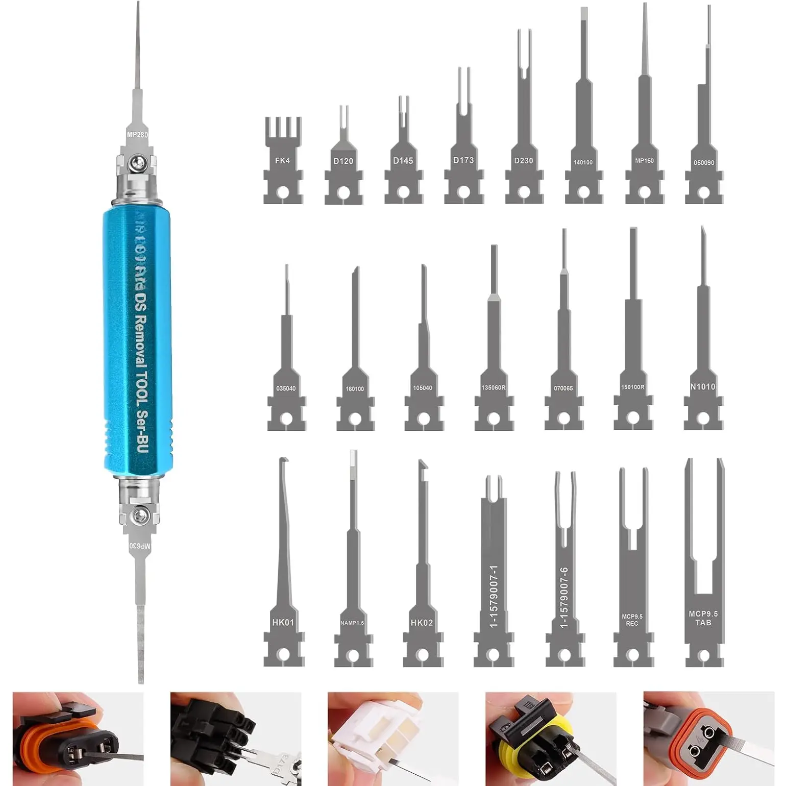 N1010 & HK01 Applicable: This Terminal Release Tool Kit includes N1010 for AMP Superseal 1.5, GT150/280, Molex 5015 Metri-Pack 150/280,TE Dynamic 3000; HK01 for Connector with Secondary Locking Device of AMP and others