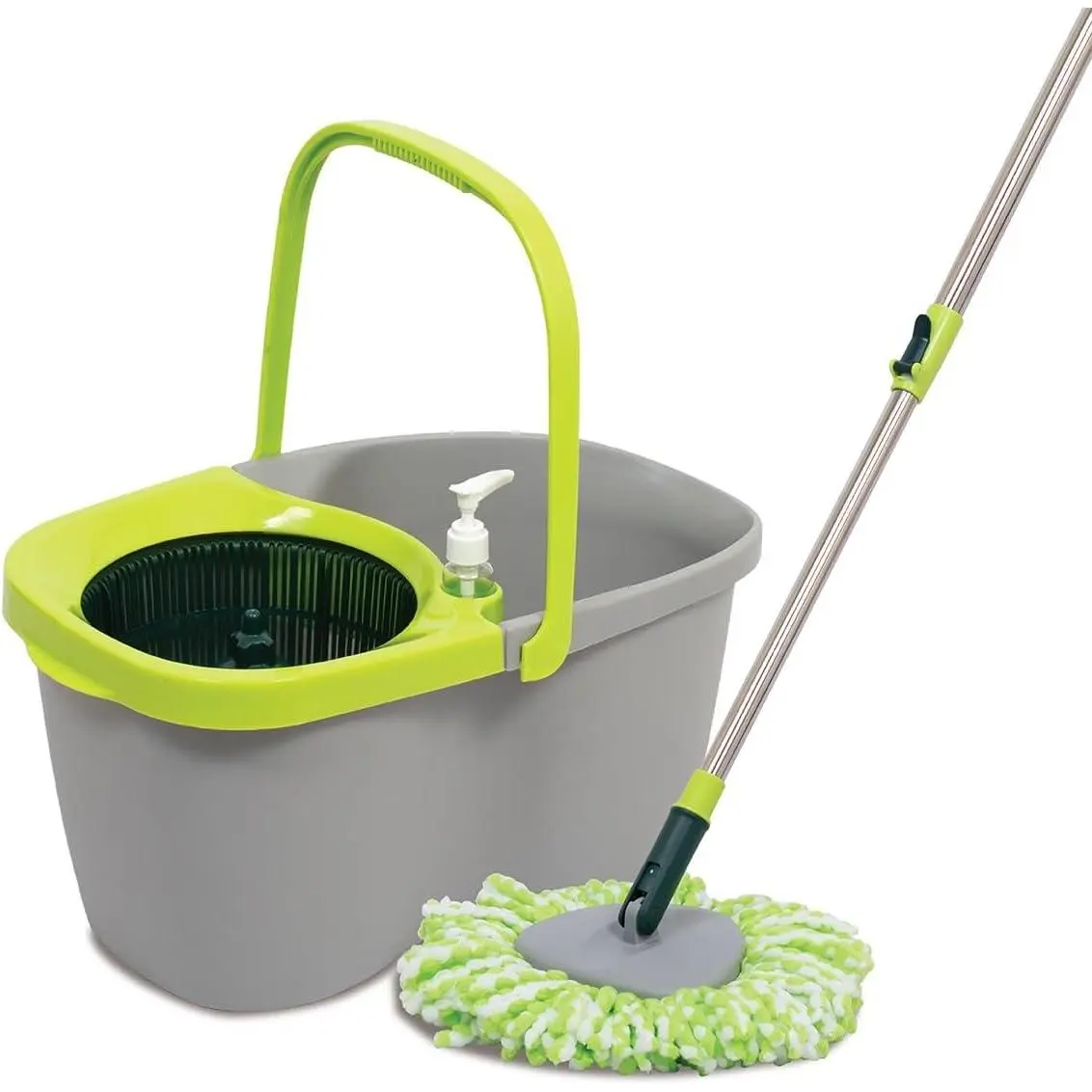 ALL-IN-ONE CLEANING SYSTEM: A versatile household cleaning kit great for hard floors, kitchens, and bathrooms.This cleaning bundle includes one extendable microfiber mop, an easy-wring spin bucket, and refillable pump bottle to dispense Pine-Sol cleaning solution right into the bucket.HEAVY DUTY MICROFIBER FOR THAT DEEP CLEAN: Highly absorbent microfiber effortlessly cleans and scrubs, while the gentle threads won’t scratch wood, laminate, linoleum, and tile floors.WET MOPPING MADE SIMPLE: Control your mop’s wetness and rapidly remove excess water with the bucket’s spinning chamber.Spinner keeps mop upright in bucket for a hassle-free cleaning experience.SPACE-SAVING WITH TELESCOPING HANDLE: Stainless steel handle extends from 38.5 inches to 50 inches for a user-friendly design.Then collapse handle for compact storage.Easy 3-step assembly required.REUSABLE, EASY TO USE DESIGN: The mop head swivels 180 degrees and goes flat to easily tackle corners and hard-to-reach areas.When finished, simply pop the microfiber threads in the washing machine.