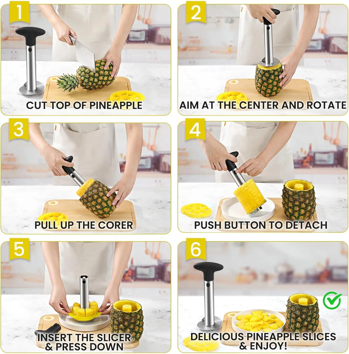 ·EASY TO USE: Cut top of the pineapple, insert Slicer into Corer Tool, aim at the center and rotate clockwise. Slightly pull it up and detach the handle. Press down the Slicer. Then, you get good equivalent pineapple slices right away! The ergonomic non-slip grip will help you cut with ease.