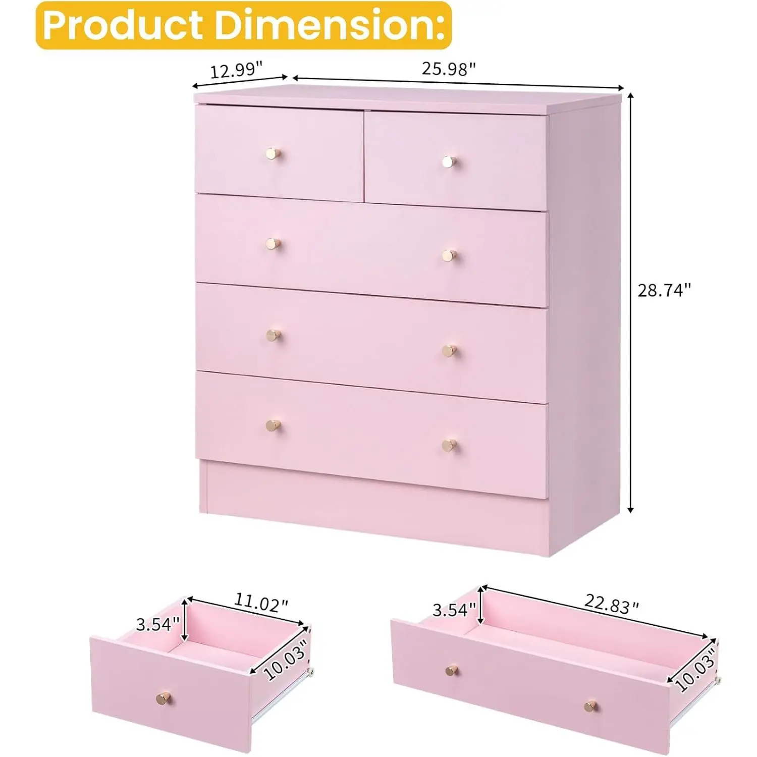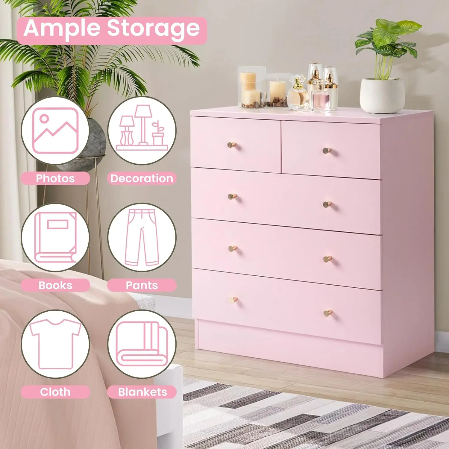 Practical 5 Drawer Pink Dresser