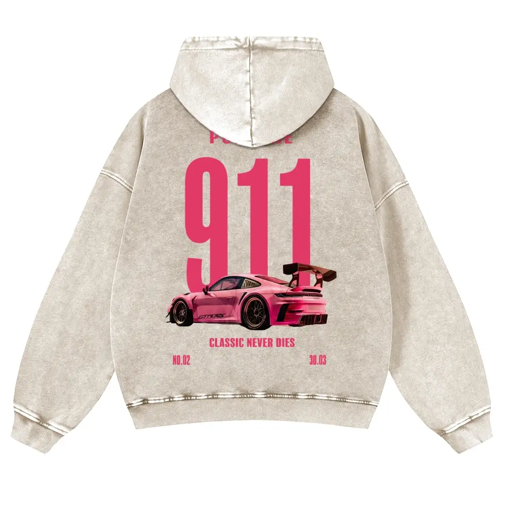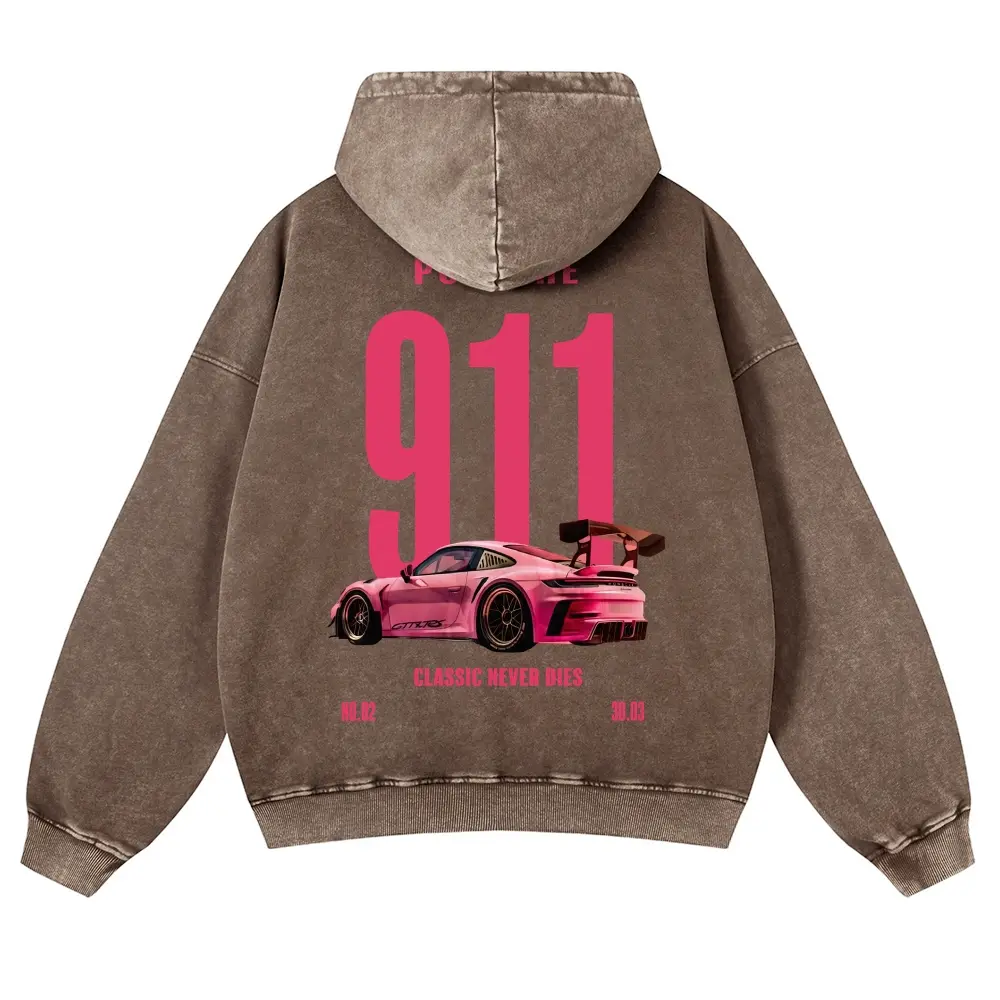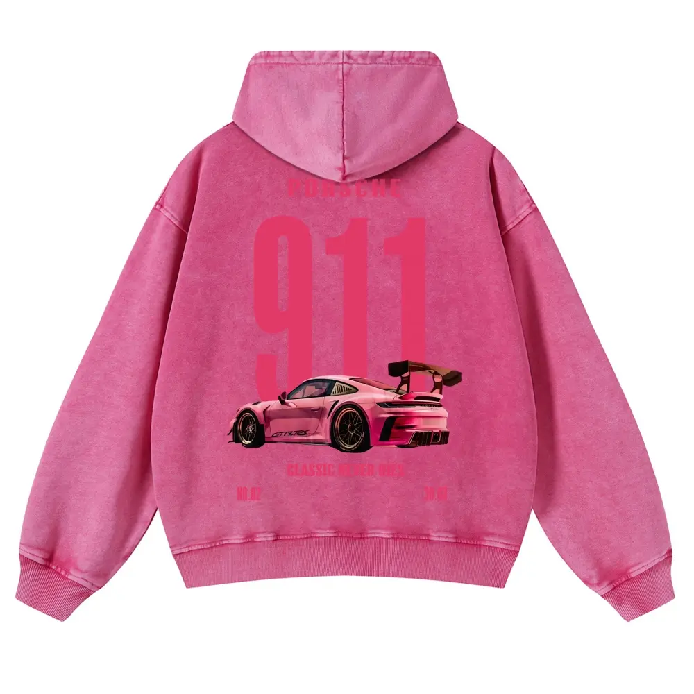5. Pink 911 Classic Never Dies Super Car 380g Autumn VIntage Washed Hoodie Graphic Sweatshirt