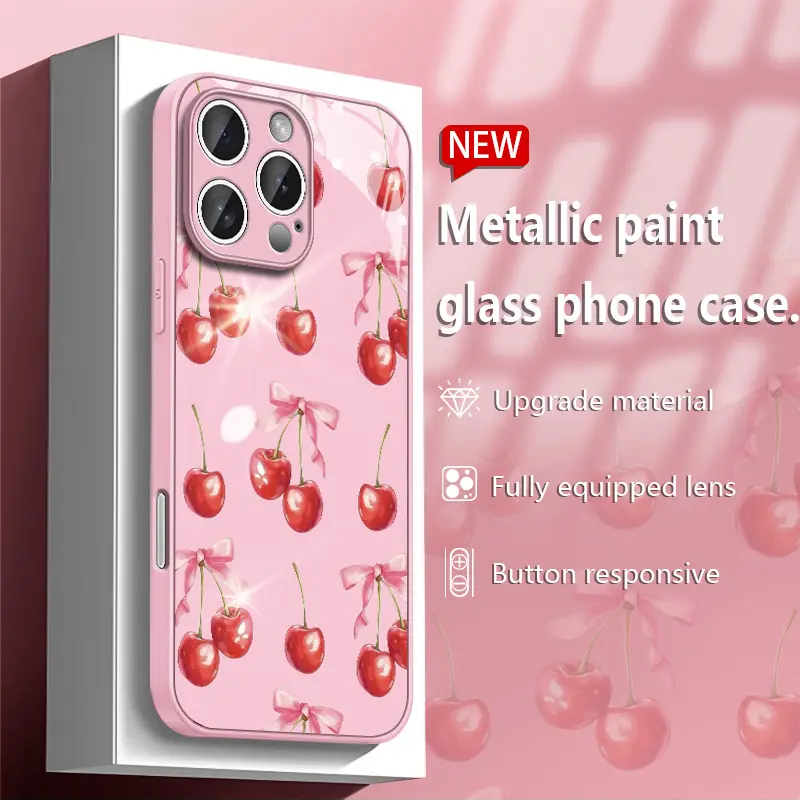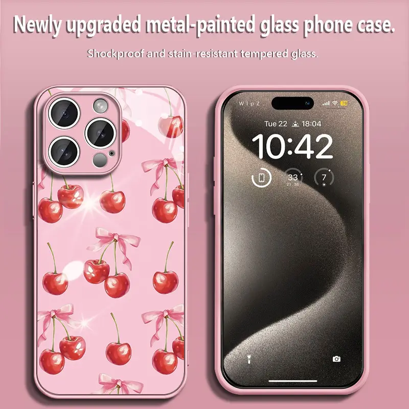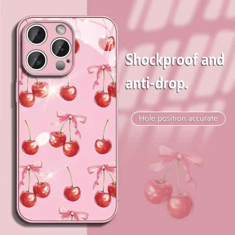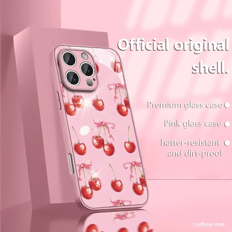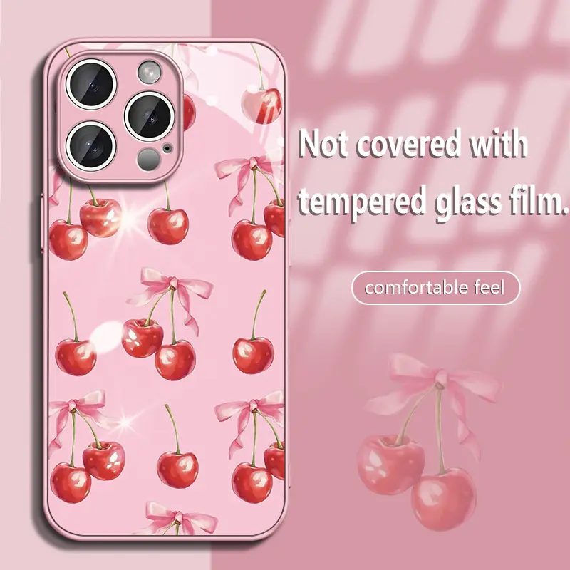 📱Pink Bow & Cherry Pattern Tempered Glass Case for iPhone 13/14/15/16 Pro/17 Pro Max