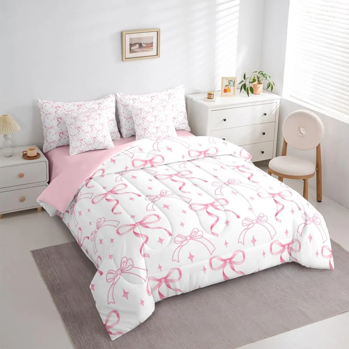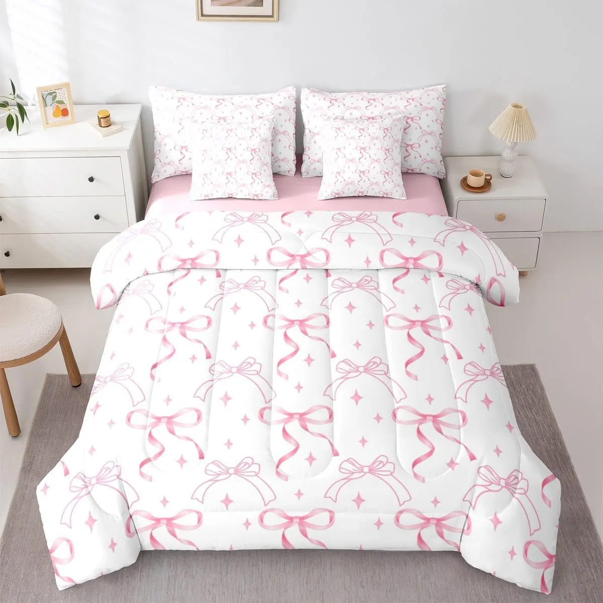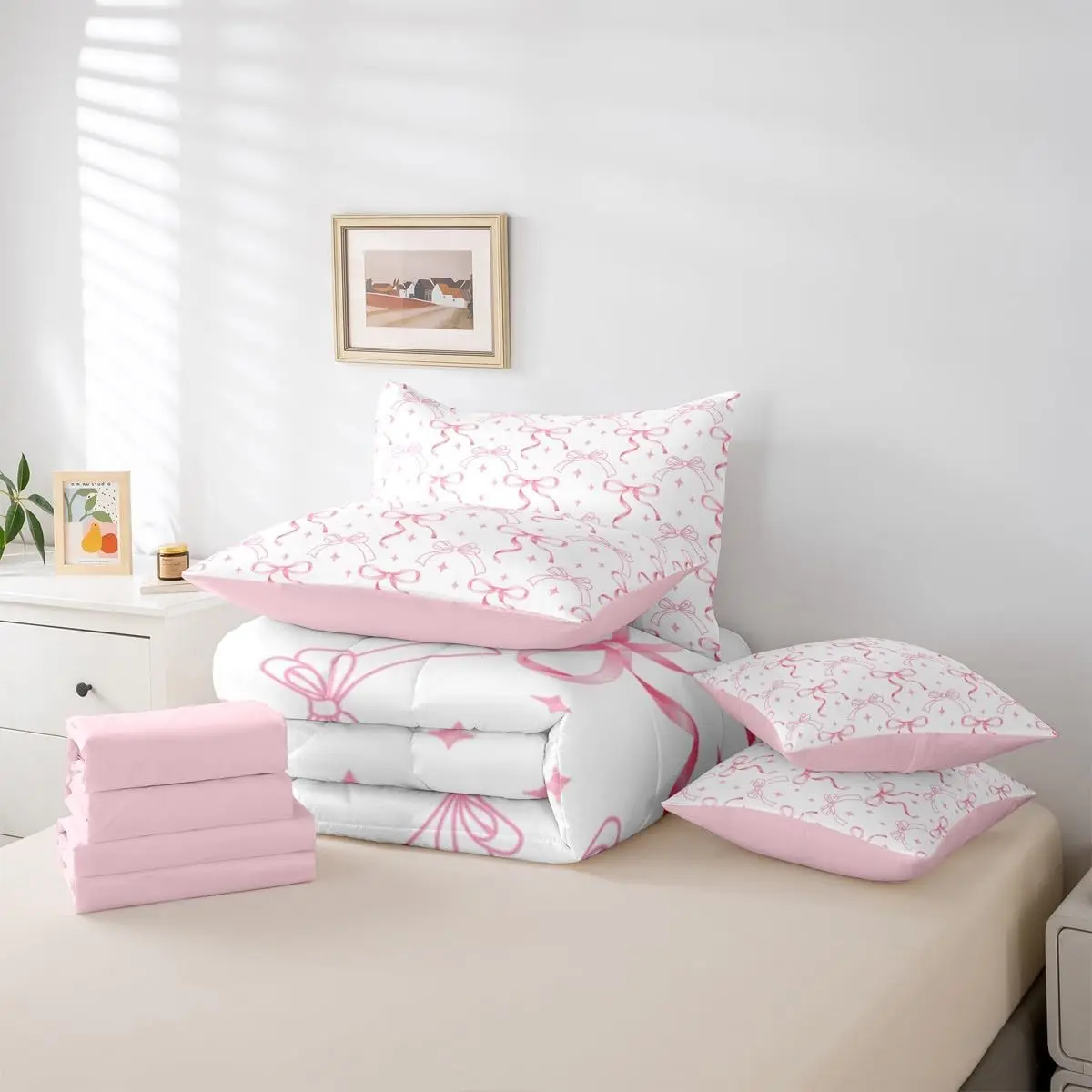5. Pink Bow Knot 7 Piece Bedding Set,Bowknot Comforter Set with Sheets Coquette Bow Tie Bed in a Bag,Aesthetic Butterfly Knot Bed Sets Quilt