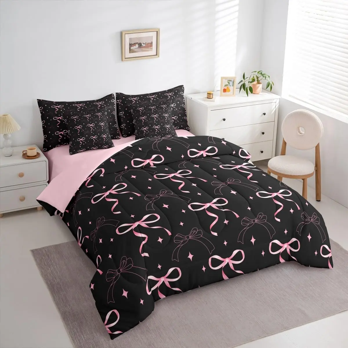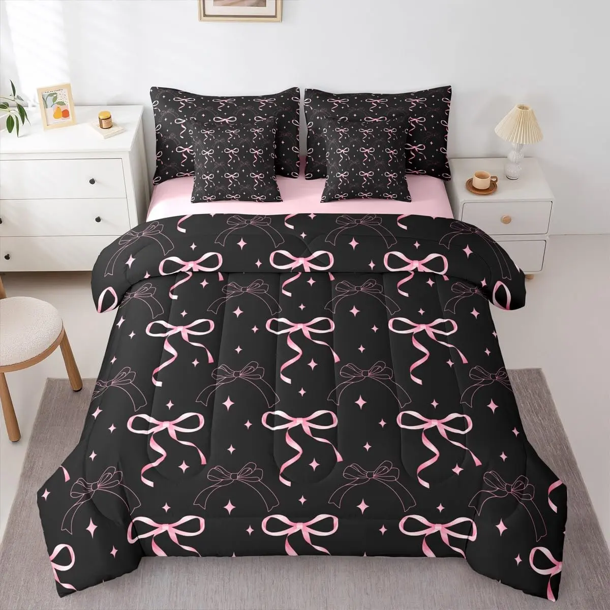 Pink Bowknot 7 Piece Bedding Set,Black Bow Knot Comforter Set with Sheets, Bow Tie Butterfly Knot Bed in a Bag,Coquette Aesthetic Bed Sets